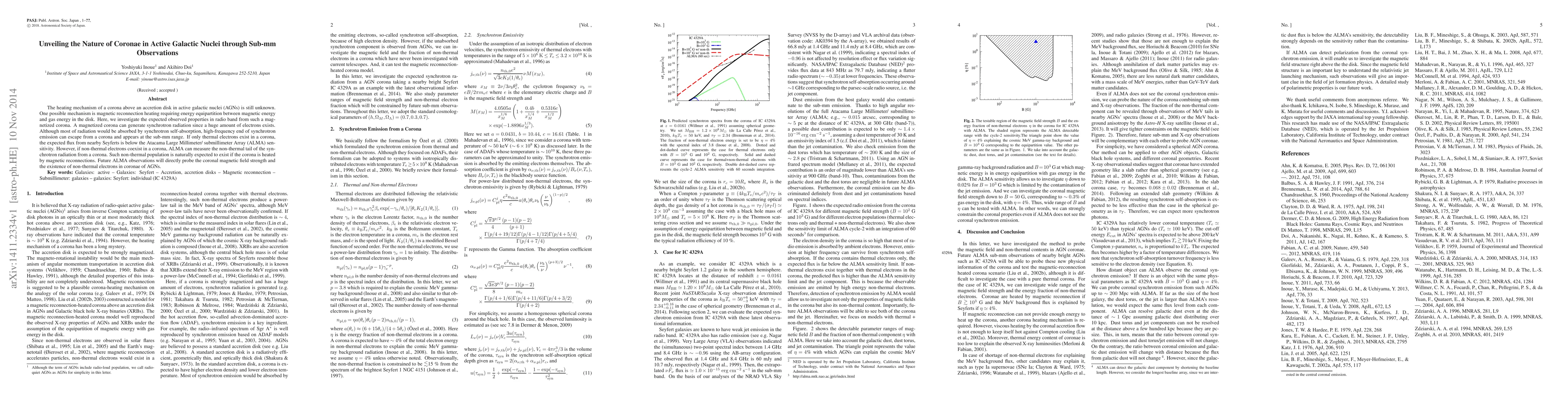 The heating mechanism of a corona above an accretion disk in active galactic nuclei (AGNs) is still unknown. One possible mechanism is magnetic reconnection heating requiring energy equipartition between magnetic energy and gas energy in the disk. Here, we investigate the expected observed properties in radio band from such a magnetized corona. A magnetized corona can generate synchrotron radiation since a huge amount of electrons exists. Although most of radiation would be absorbed by synchrotron self-absorption, high-frequency end of synchrotron emission can escape from a corona and appears at the sub-mm range. If only thermal electrons exist in a corona, the expected flux from nearby Seyferts is below the Atacama Large Millimeter/ submillimeter Array (ALMA) sensitivity. However, if non-thermal electrons coexist in a corona, ALMA can measure the non-thermal tail of the synchrotron radiation from a corona. Such non-thermal population is naturally expected to exist if the corona is heated by magnetic reconnections. Future ALMA observations will directly probe the coronal magnetic field strength and the existence of non-thermal electrons in coronae of AGNs.