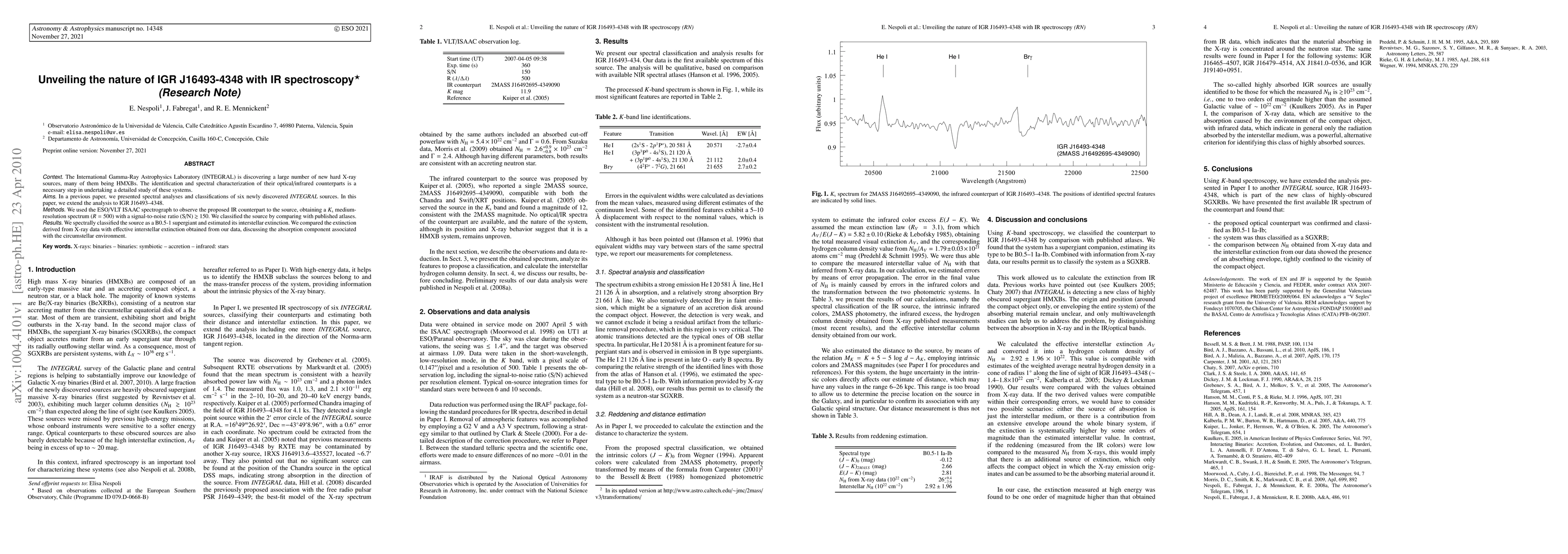 The International Gamma-Ray Astrophysics Laboratory (INTEGRAL) is discovering a large number of new hard X-ray sources, many of them being HMXBs. The identification and spectral characterization of their optical/infrared counterparts is a necessary step in undertaking a detailed study of these systems. In a previous paper, we presented spectral analyses and classifications of six newly discovered INTEGRAL sources. In this paper, we extend the analysis to IGR J16493-4348. We used the ESO/VLT ISAAC spectrograph to observe the proposed IR counterpart to the source, obtaining a Ks medium-resolution spectrum (R = 500) with a signal-to-noise ratio (S/N) >150. We classified the source by comparing with published atlases. We spectrally classified the source as a B0.5-1 supergiant and estimated its interstellar extinction. We compared the extinction derived from X-ray data with effective interstellar extinction obtained from our data, discussing the absorption component associated with the circumstellar environment.
