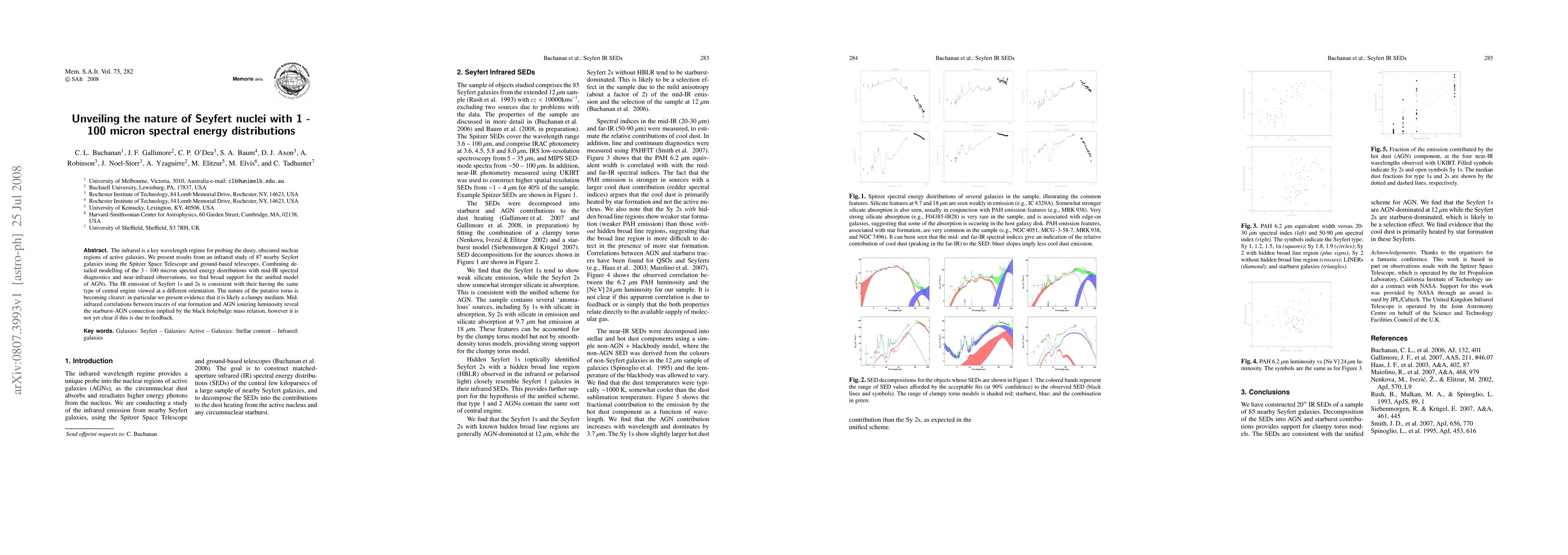 The infrared is a key wavelength regime for probing the dusty, obscured nuclear regions of active galaxies. We present results from an infrared study of 87 nearby Seyfert galaxies using the Spitzer Space Telescope and ground-based telescopes. Combining detailed modelling of the 3 - 100 micron spectral energy distributions with mid-IR spectral diagnostics and near-infrared observations, we find broad support for the unified model of AGNs. The IR emission of Seyfert 1s and 2s is consistent with their having the same type of central engine viewed at a different orientation. The nature of the putative torus is becoming clearer; in particular we present evidence that it is likely a clumpy medium. Mid-infrared correlations between tracers of star formation and AGN ionizing luminosity reveal the starburst-AGN connection implied by the black hole/bulge mass relation, however it is not yet clear if this is due to feedback.