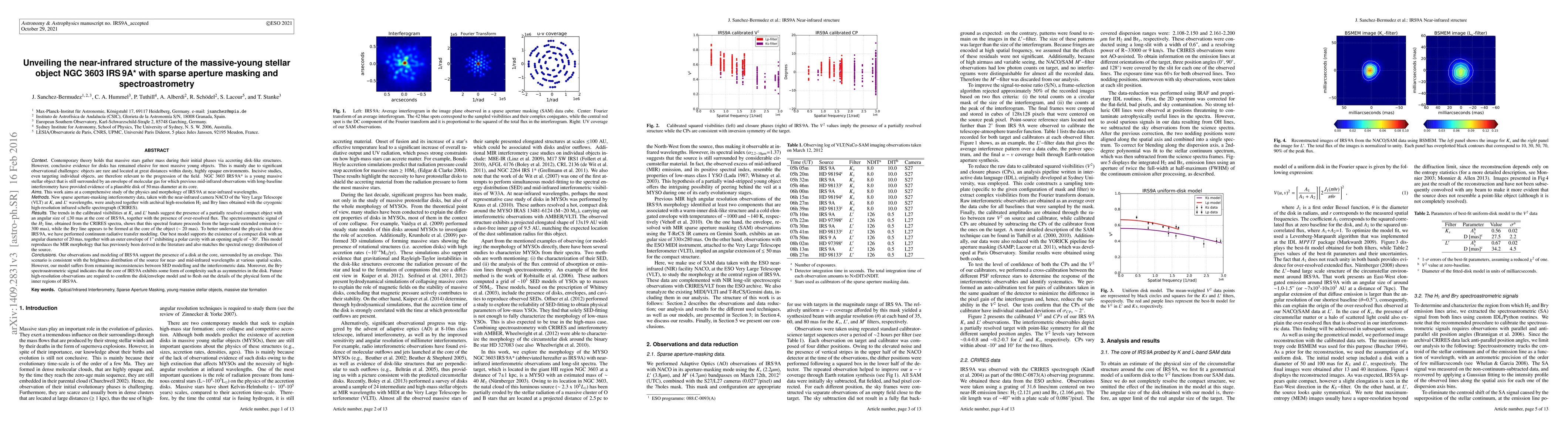 Contemporary theory holds that massive stars gather mass during their initial phases via accreting disk-like structures. However, conclusive evidence for disks has remained elusive for the most massive young objects. This is mainly due to significant observational challenges. Incisive studies, even targeting individual objects, are therefore relevant to the progression of the field. NGC 3603 IRS 9A* is a young massive stellar object still surrounded by an envelope of molecular gas. Previous mid-infrared observations with long-baseline interferometry provided evidence for a disk of 50 mas diameter at its core. This work aims at a comprehensive study of the physics and morphology of IRS 9A at near-infrared wavelengths. New sparse aperture masking interferometry data taken with NACO/VLT at Ks and Lp filters were obtained and analysed together with archival CRIRES spectra of the H2 and BrG lines. The calibrated visibilities recorded at Ks and Lp bands suggest the presence of a partially resolved compact object of 30 mas at the core of IRS 9A, together with the presence of over-resolved flux. The spectroastrometric signal of the H2 line shows that this spectral feature proceeds from the large scale extended emission (300 mas) of IRS 9A, while the BrG line appears to be formed at the core of the object (20 mas). This scenario is consistent with the brightness distribution of the source for near- and mid-infrared wavelengths at various spatial scales. However, our model suffers from remaining inconsistencies between SED modelling and the interferometric data. Moreover, the BrG spectroastrometric signal indicates that the core of IRS 9A exhibits some form of complexity such as asymmetries in the disk. Future high-resolution observations are required to confirm the disk/envelope model and to flesh out the details of the physical form of the inner regions of IRS 9A.