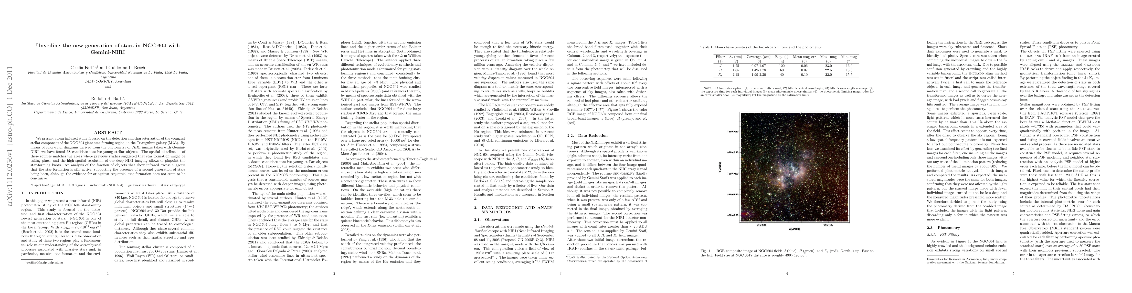 We present a near infrared study focused on the detection and characterization of the youngest stellar component of the NGC 604 giant star-forming region, in the Triangulum galaxy (M 33). By means of color-color diagrams derived from the photometry of JHKs images taken with Gemini-NIRI, we have found 68 candidate massive young stellar objects. The spatial distribution of these sources matches the areas where previous studies suggested that star formation might be taking place, and the high spatial resolution of our deep NIRI imaging allows to pinpoint the star-forming knots. An analysis of the fraction of objects that show infrared excess suggests that the star formation is still active, supporting the presence of a second generation of stars being born, although the evidence for or against sequential star formation does not seem to be conclusive.