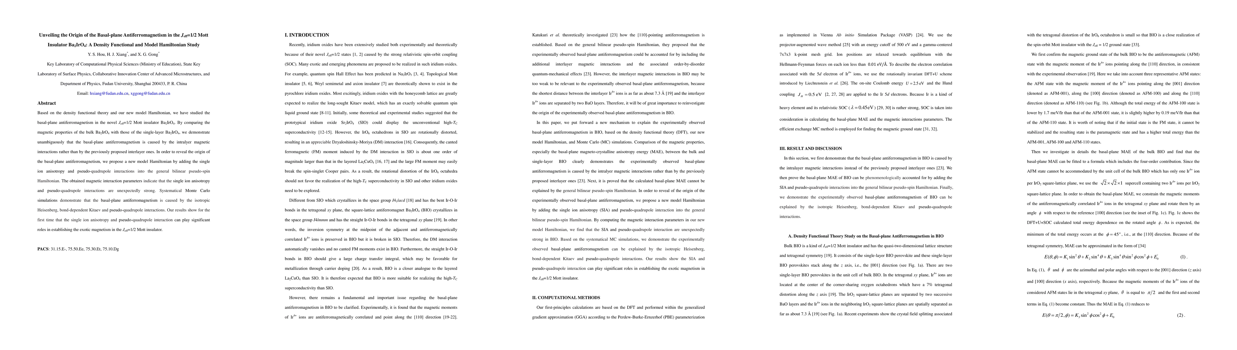 Researchers studied the Jeff=1/2 Mott insulator Ba2IrO4, finding that basal-plane antiferromagnetism is caused by intralayer magnetic interactions, not interlayer ones, and that single ion anisotropy and pseudo-quadrupole interactions play a significant role in establishing exotic magnetism.