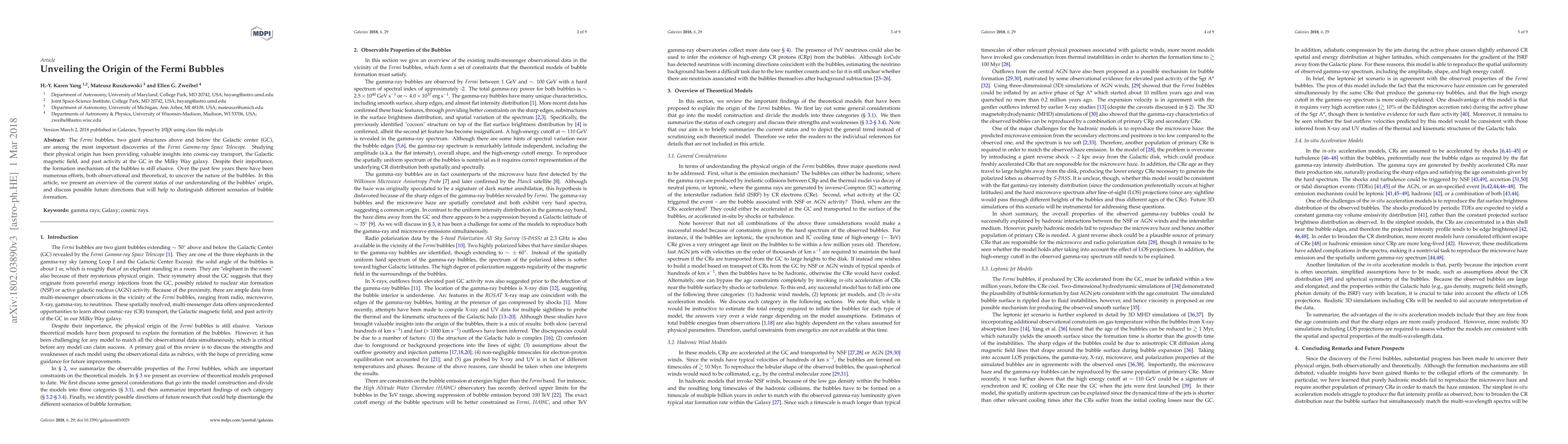 The Fermi bubbles, two giant structures above and below the Galactic center (GC), are among the most important discoveries of the Fermi Gamma-ray Space Telescope. Studying their physical origin has been providing valuable insights into cosmic-ray transport, the Galactic magnetic field, and past activity at the GC in the Milky Way galaxy. Despite their importance, the formation mechanism of the bubbles is still elusive. Over the past few years there have been numerous efforts, both observational and theoretical, to uncover the nature of the bubbles. In this article, we present an overview of the current status of our understanding of the bubbles' origin, and discuss possible future directions that will help to distinguish different scenarios of bubble formation.