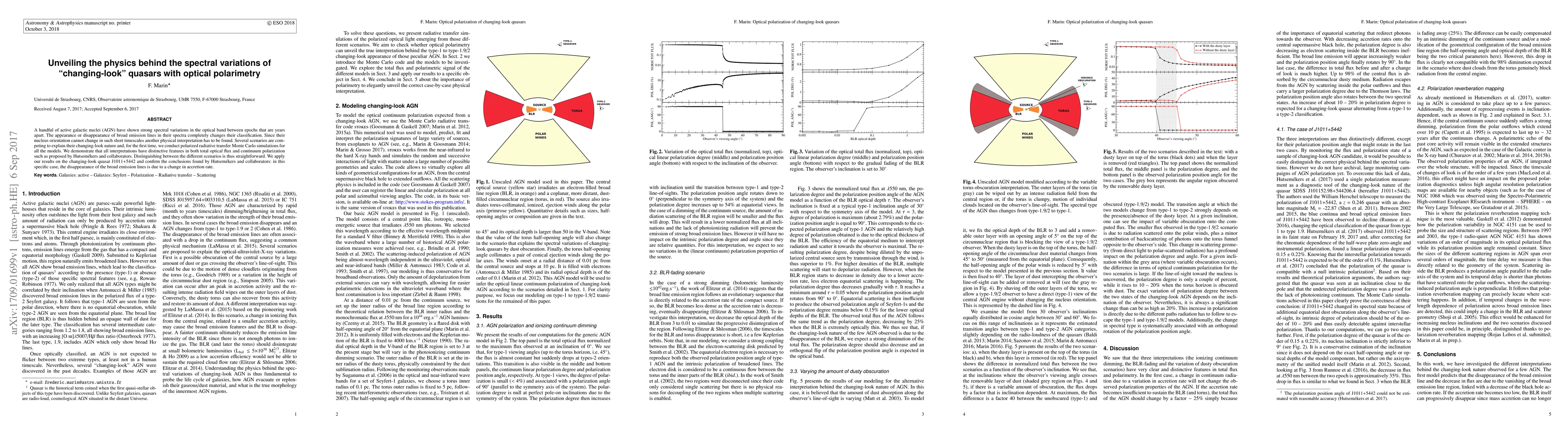 This paper investigates the spectral variations in "changing-look" quasars using optical polarimetry and polarized radiative transfer simulations. It concludes that different physical explanations for these variations, such as changes in accretion rate, can be distinguished by their unique optical flux and polarization signatures.