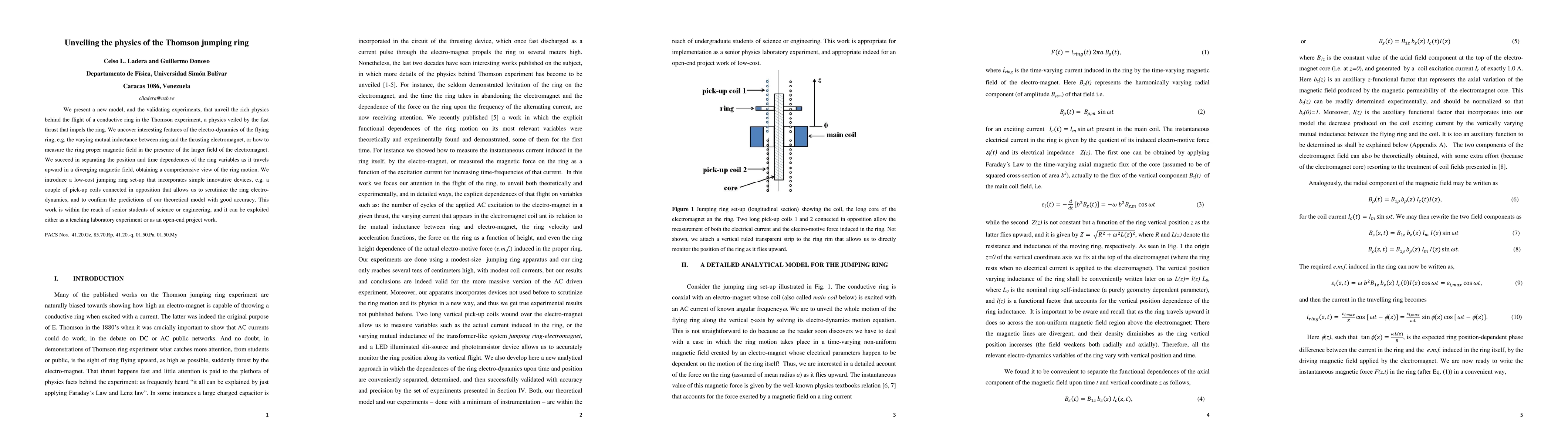 We present a new model, and the validating experiments, that unveil the rich physics behind the flight of a conductive ring in the Thomson experiment, a physics veiled by the fast thrust that impels the ring. We uncover interesting features of the electro-dynamics of the flying ring, e.g. the varying mutual inductance between ring and the thrusting electromagnet, or how to measure the ring proper magnetic field in the presence of the larger field of the electromagnet. We succeed in separating the position and time dependences of the ring variables as it travels upward in a diverging magnetic field, obtaining a comprehensive view of the ring motion. We introduce a low-cost jumping ring set-up that incorporates simple innovative devices, e.g. a couple of pick-up coils connected in opposition that allows us to scrutinize the ring electro-dynamics, and to confirm the predictions of our theoretical model with good accuracy. This work is within the reach of senior students of science or engineering, and it can be exploited either as a teaching laboratory experiment or as an open-end project work.