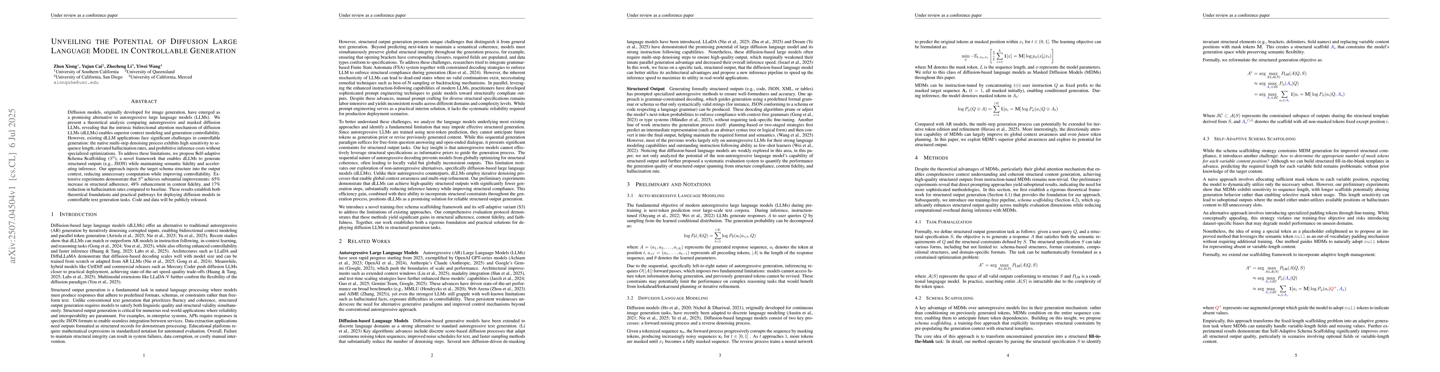 Diffusion models, originally developed for image generation, have emerged as a promising alternative to autoregressive large language models (LLMs). We present a theoretical analysis comparing autoregressive and masked diffusion LLMs, revealing that the intrinsic bidirectional attention mechanism of diffusion LLMs (dLLMs) enables superior context modeling and generation controllability. However, existing dLLM applications face significant challenges in controllable generation: the native multi-step denoising process exhibits high sensitivity to sequence length, elevated hallucination rates, and prohibitive inference costs without specialized optimizations. To address these limitations, we propose \textbf{S}elf-adaptive \textbf{S}chema \textbf{S}caffolding ($S^3$), a novel framework that enables dLLMs to generate structured outputs (e.g., JSON) while maintaining semantic fidelity and accelerating inference. Our approach injects the target schema structure into the output context, reducing unnecessary computation while improving controllability. Extensive experiments demonstrate that $S^3$ achieves substantial improvements: 65\% increase in structural adherence, 48\% enhancement in content fidelity, and 17\% reduction in hallucination rates compared to baseline. These results establish both theoretical foundations and practical pathways for deploying diffusion models in controllable text generation tasks. Code and data will be publicly released.