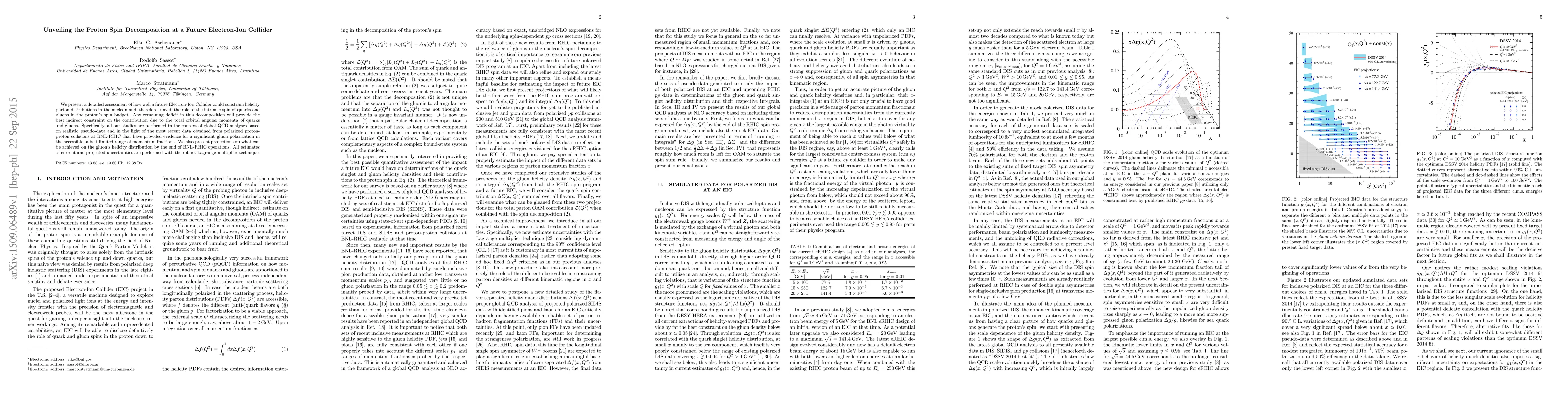 We present a detailed assessment of how well a future Electron-Ion Collider could constrain helicity parton distributions in the nucleon and, therefore, unveil the role of the intrinsic spin of quarks and gluons in the proton's spin budget. Any remaining deficit in this decomposition will provide the best indirect constraint on the contribution due to the total orbital angular momenta of quarks and gluons. Specifically, all our studies are performed in the context of global QCD analyses based on realistic pseudo-data and in the light of the most recent data obtained from polarized proton-proton collisions at BNL-RHIC that have provided evidence for a significant gluon polarization in the accessible, albeit limited range of momentum fractions. We also present projections on what can be achieved on the gluon's helicity distribution by the end of BNL-RHIC operations. All estimates of current and projected uncertainties are performed with the robust Lagrange multiplier technique.
