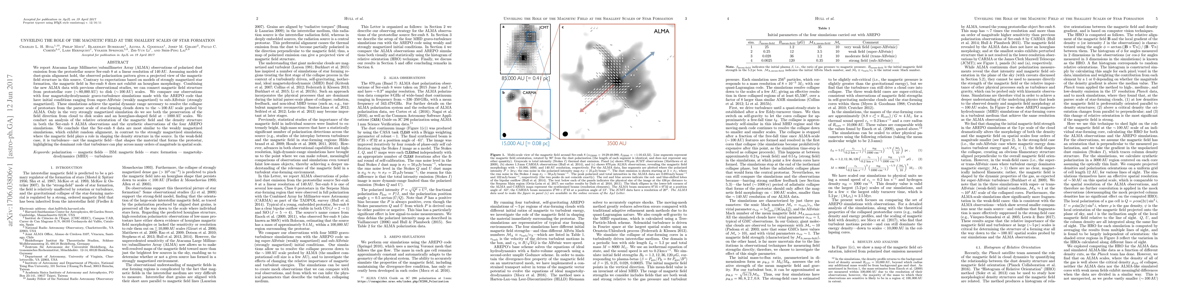 We report ALMA observations of polarized dust emission from the protostellar source Ser-emb 8 at a linear resolution of 140 au. Assuming models of dust-grain alignment hold, the observed polarization pattern gives a projected view of the magnetic field structure in this source. Contrary to expectations based on models of strongly magnetized star formation, the magnetic field in Ser-emb 8 does not exhibit an hourglass morphology. Combining the new ALMA data with previous observational studies, we can connect magnetic field structure from protostellar core (~80,000 au) to disk (~100 au) scales. We compare our observations with four magnetohydrodynamic gravo-turbulence simulations made with the AREPO code that have initial conditions ranging from super-Alfv\'enic (weakly magnetized) to sub-Alfv\'enic (strongly magnetized). These simulations achieve the spatial dynamic range necessary to resolve the collapse of protostars from the parsec scale of star-forming clouds down to the ~100 au scale probed by ALMA. Only in the very strongly magnetized simulation do we see both the preservation of the field direction from cloud to disk scales and an hourglass-shaped field at < 1000 au scales. We conduct an analysis of the relative orientation of the magnetic field and the density structure in both the Ser-emb 8 ALMA observations and the synthetic observations of the four AREPO simulations. We conclude that the Ser-emb 8 data are most similar to the weakly magnetized simulations, which exhibit random alignment, in contrast to the strongly magnetized simulation, where the magnetic field plays a role in shaping the density structure in the source. In the weak-field case, it is turbulence -- not the magnetic field -- that shapes the material that forms the protostar, highlighting the dominant role that turbulence can play across many orders of magnitude in spatial scale.