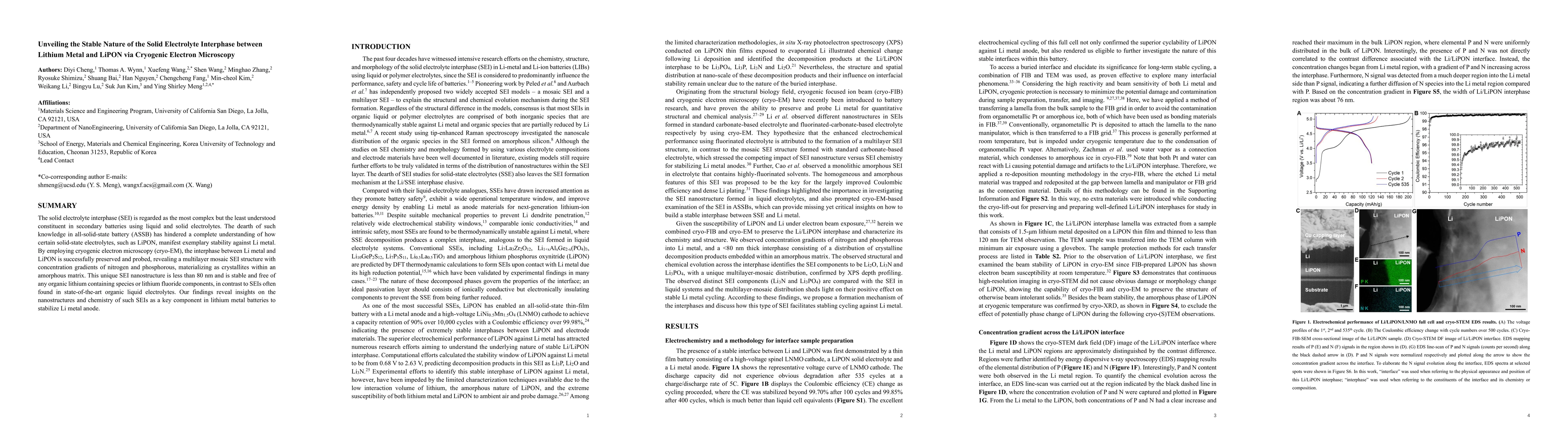 This study employs cryogenic electron microscopy to reveal the stable, multilayer mosaic structure of the solid electrolyte interphase (SEI) between lithium metal and LiPON in all-solid-state batteries, characterized by concentration gradients of nitrogen and phosphorous within an amorphous matrix. The identified SEI is stable, free of organic lithium compounds and lithium fluoride, providing insights into stabilizing lithium metal anodes.