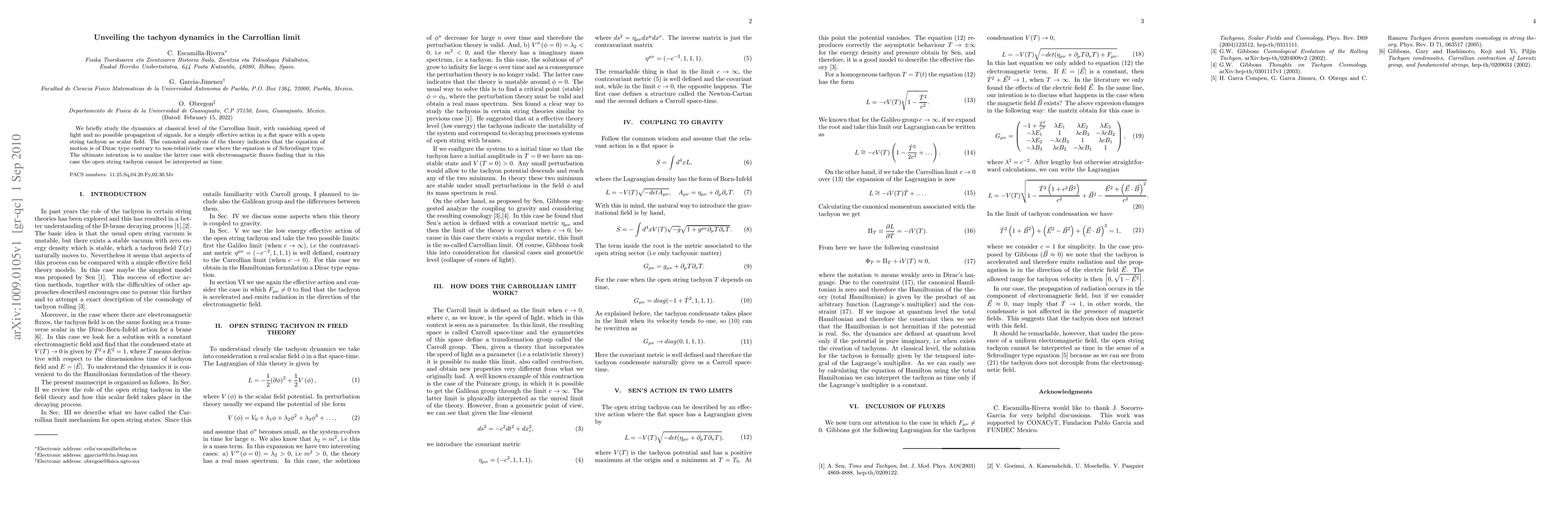 We briefly study the dynamics at classical level of the Carrollian limit, with vanishing speed of light and no possible propagation of signals, for a simply effective action in a flat space with a open string tachyon as scalar field. The canonical analysis of the theory indicates that the equation of motion is of Dirac type contrary to non-relativistic case where the equation is of Schrodinger type. The ultimate intention is to analize the latter case with electromagnetic fluxes finding that in this case the open string tachyon cannot be interpreted as time.