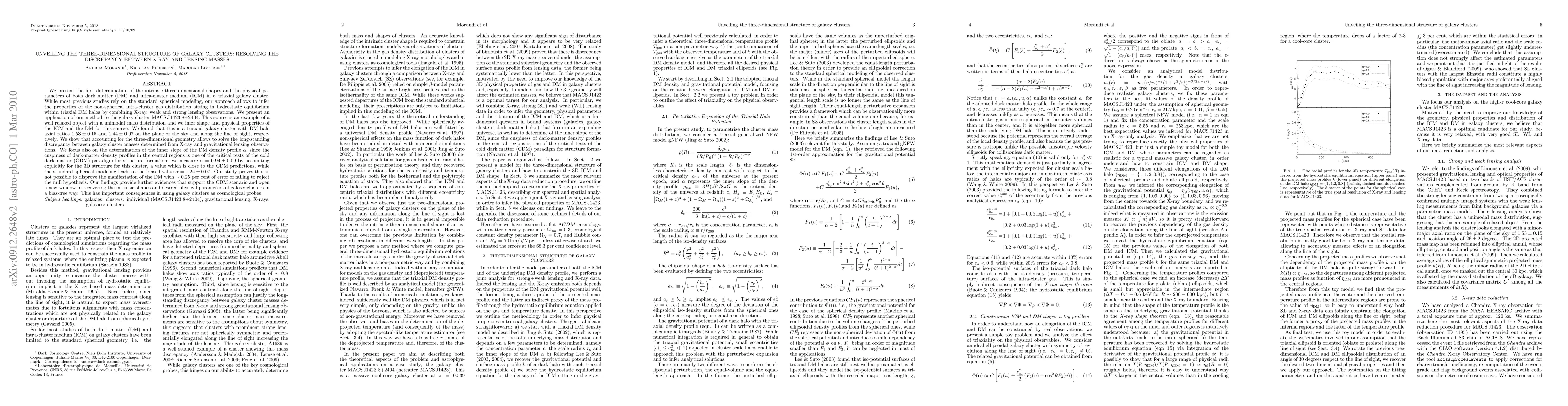 [Abridged] We present the first determination of the intrinsic three-dimensional shapes and the physical parameters of both dark matter (DM) and intra-cluster medium (ICM) in a triaxial galaxy cluster. While most previous studies rely on the standard spherical modeling, our approach allows to infer the properties of the non-spherical intra-cluster gas distribution sitting in hydrostatic equilibrium within triaxial DM halos by combining X-ray, weak and strong lensing observations. We present an application of our method to the galaxy cluster MACS J1423.8+2404. This source is an example of a well relaxed object with a unimodal mass distribution and we infer shape and physical properties of the ICM and the DM for this source. We found that this is a triaxial galaxy cluster with DM halo axial ratios 1.53+/-0.15 and 1.44+/-0.07 on the plane of the sky and along the line of sight, respectively. We show that accounting for the three-dimensional geometry allows to solve the long-standing discrepancy between galaxy cluster masses determined from X-ray and gravitational lensing observations. We focus also on the determination of the inner slope of the DM density profile alpha, since the cuspiness of dark-matter density profiles is one of the critical tests of the cold dark matter (CDM) paradigm for structure formation: we measure alpha=0.94+/-0.09 by accounting explicitly for the 3D structure for this cluster, a value which is close to the CDM predictions, while the standard spherical modeling leads to the biased value alpha=1.24+/-0.07. Our findings provide further evidences that support the CDM scenario and open a new window in recovering the intrinsic shapes and physical parameters of galaxy clusters in a bias-free way. This has important consequences in using galaxy clusters as cosmological probes.