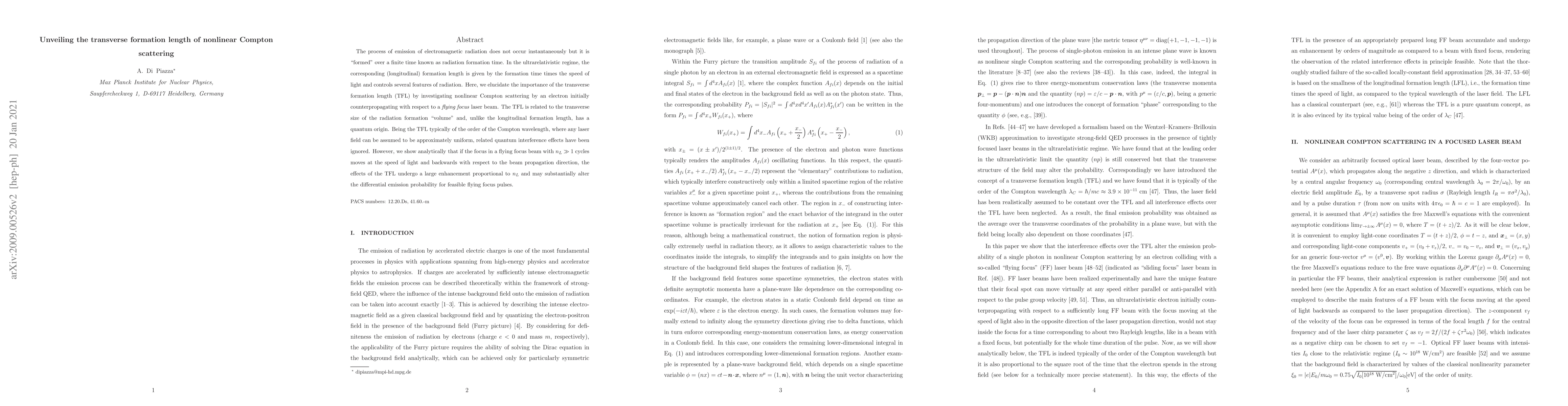 The process of emission of electromagnetic radiation does not occur instantaneously but it is "formed" over a finite time known as radiation formation time. In the ultrarelativistic regime, the corresponding (longitudinal) formation length is given by the formation time times the speed of light and controls several features of radiation. Here, we elucidate the importance of the transverse formation length (TFL) by investigating nonlinear Compton scattering by an electron initially counterpropagating with respect to a \emph{flying focus} laser beam. The TFL is related to the transverse size of the radiation formation "volume" and, unlike the longitudinal formation length, has a quantum origin. Being the TFL typically of the order of the Compton wavelength, where any laser field can be assumed to be approximately uniform, related quantum interference effects have been ignored. However, we show analytically that if the focus in a flying focus beam with $n_L\gg 1$ cycles moves at the speed of light and backwards with respect to the beam propagation direction, the effects of the TFL undergo a large enhancement proportional to $n_L$ and may substantially alter the differential emission probability for feasible flying focus pulses.