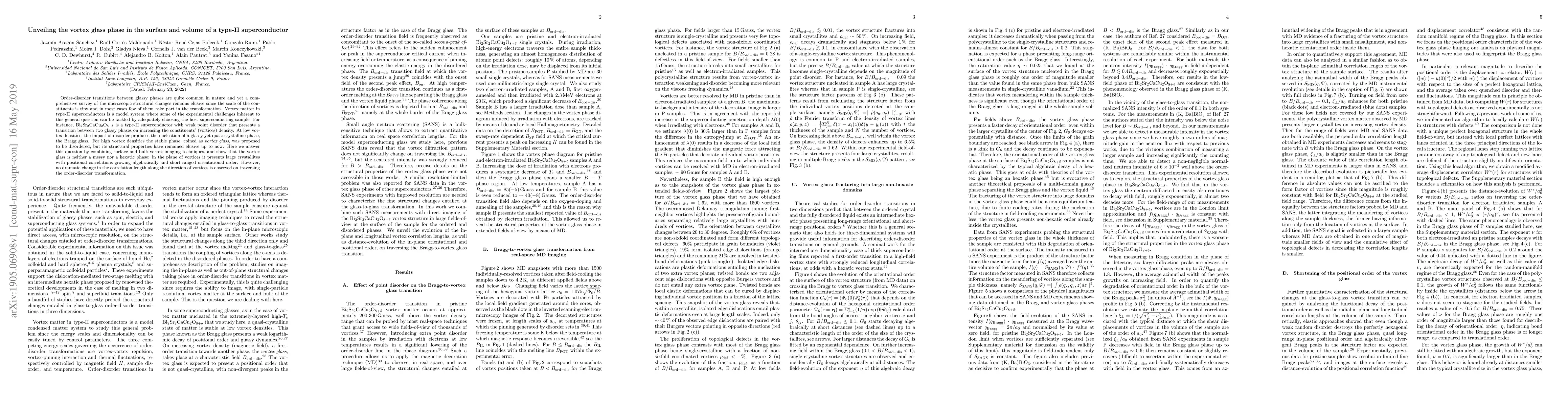 Order-disorder transitions between glassy phases are quite common in nature and yet a comprehensive survey of the microscopic structural changes remains elusive since the scale of the constituents is tiny and in most cases few of them take part in the transformation. Vortex matter in type-II superconductors is a model system where some of the experimental challenges inherent to this general question can be tackled by adequately choosing the host superconducting sample. For instance, Bi$_{2}$Sr$_{2}$CaCu$_{2}$O$_{8 + \delta}$ is a type-II superconductor with weak point disorder that presents a transition between two glassy phases on increasing the constituents' (vortices) density. At low vortex densities, the impact of disorder produces the nucleation of a glassy yet quasi-crystalline phase, the Bragg glass. For high vortex densities the stable phase, coined as $\textit{vortex glass}$, was proposed to be disordered, but its structural properties have remained elusive up to now. Here we answer this question by combining surface and bulk vortex imaging techniques, and show that the vortex glass is neither a messy nor a hexatic phase: in the plane of vortices it presents large crystallites with positional correlations growing algebraically and short-ranged orientational order. However, no dramatic change in the correlation length along the direction of vortices is observed on traversing the order-disorder transformation.