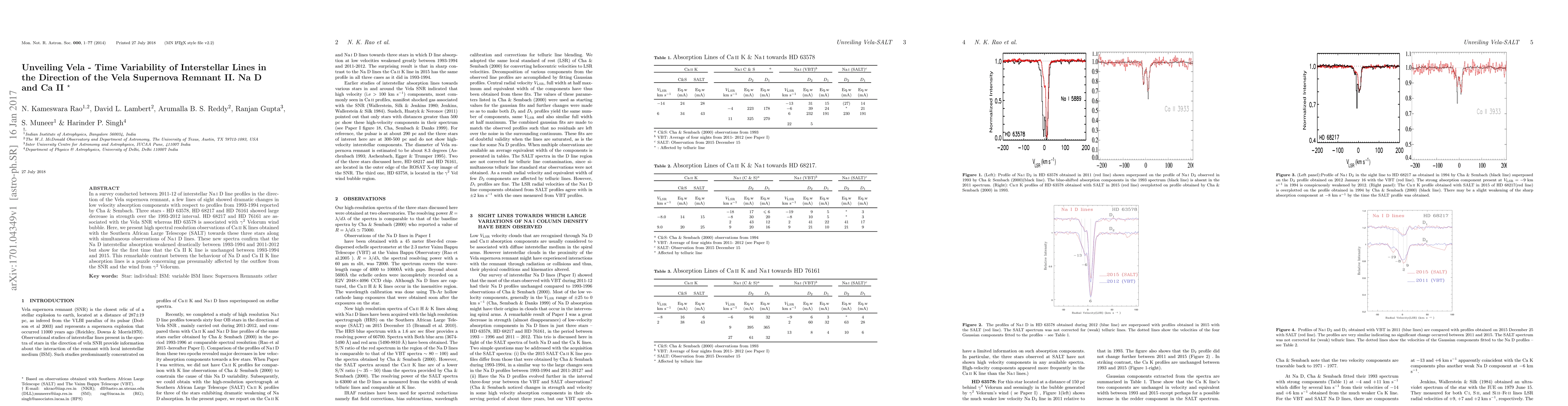 In a survey conducted between 2011-12 of interstellar Na I D line profiles in the direction of the Vela supernova remnant, a few lines of sight showed dramatic changes in low velocity absorption components with respect to profiles from 1993-1994 reported by Cha & Sembach. Three stars - HD 63578, HD 68217 and HD 76161 showed large decrease in strength over the 1993-2012 interval. HD 68217 and HD 76161 are associated with the Vela SNR whereas HD 63578 is associated with $\gamma^2$ Velorum wind bubble. Here, we present high spectral resolution observations of Ca II K lines obtained with the Southern African Large Telescope (SALT) towards these three stars along with simultaneous observations of Na I D lines. These new spectra confirm that the Na D interstellar absorption weakened drastically between 1993-1994 and 2011-2012 but show for the first time that the Ca II K line is unchanged between 1993-1994 and 2015. This remarkable contrast between the behaviour of Na D and Ca II K line absorption lines is a puzzle concerning gas presumably affected by the outflow from the SNR and the wind from $\gamma^2$ Velorum.