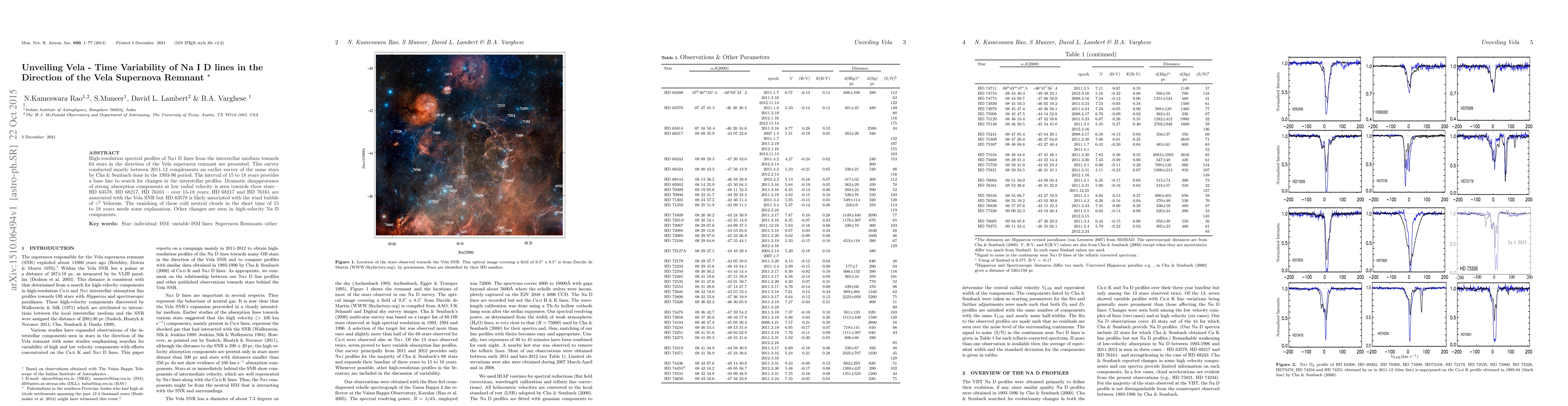High-resolution spectral profiles of Na I D lines from the interstellar medium towards 64 stars in the direction of the Vela supernova remnant are presented. This survey conducted mostly between 2011-12 complements an earlier survey of the same stars by Cha & Sembach done in the 1993-96 period. The interval of 15 to 18 years provides a base line to search for changes in the interstellar profiles. Dramatic disappearance of strong absorption components at low radial velocity is seen towards three stars - HD 63578, HD 68217, HD 76161 - over 15-18 years; HD 68217 and HD 76161 are associated with the Vela SNR but HD 63578 is likely associated with the wind bubble of g2 Velorum. The vanishing of these cold neutral clouds in the short time of 15 to 18 years needs some explanation. Other changes are seen in high-velocity Na D components.