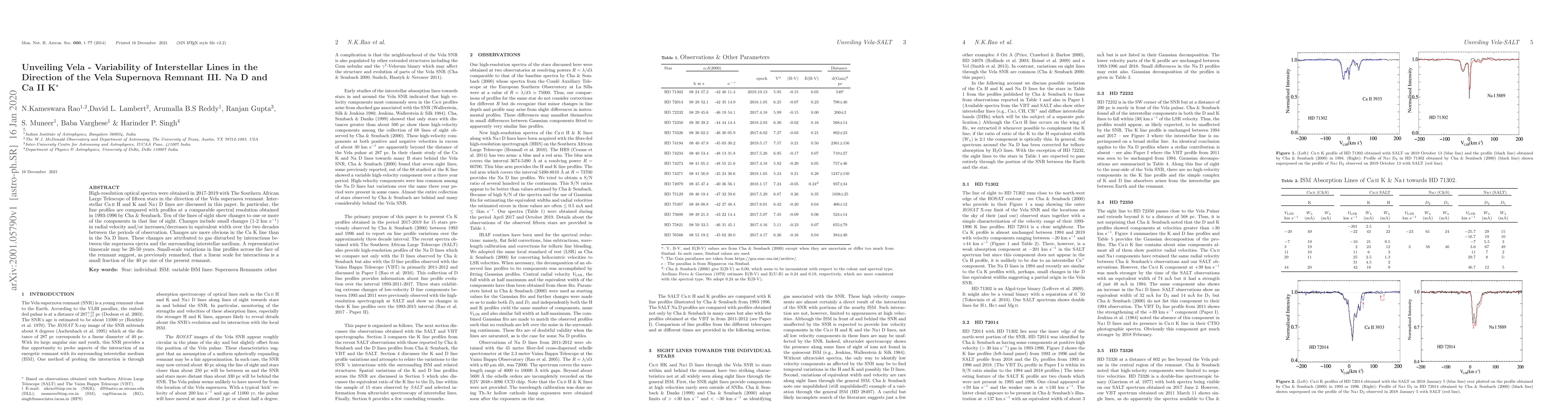 High-resolution optical spectra were obtained in 2017-2019 with The Southern African Large Telescope of fifteen stars in the direction of the Vela supernova remnant. Interstellar Ca ii H and K and Na i D lines are discussed in this paper. In particular, the line profiles are compared with profiles at a comparable spectral resolution obtained in 1993-1996 by Cha & Sembach. Ten of the lines of sight show changes to one or more of the components in that line of sight. Changes include small changes (1-2 km/s) in radial velocity and/or increases/decreases in equivalent width over the two decades between the periods of observation. Changes are more obvious in the Ca K line than in the Na D lines. These changes are attributed to gas disturbed by interactions between the supernova ejecta and the surrounding interstellar medium. A representative timescale may be 20-50 years. Small-scale variations in line profiles across the face of the remnant suggest, as previously remarked, that a linear scale for interactions is a small fraction of the 40 pc size of the present remnant.