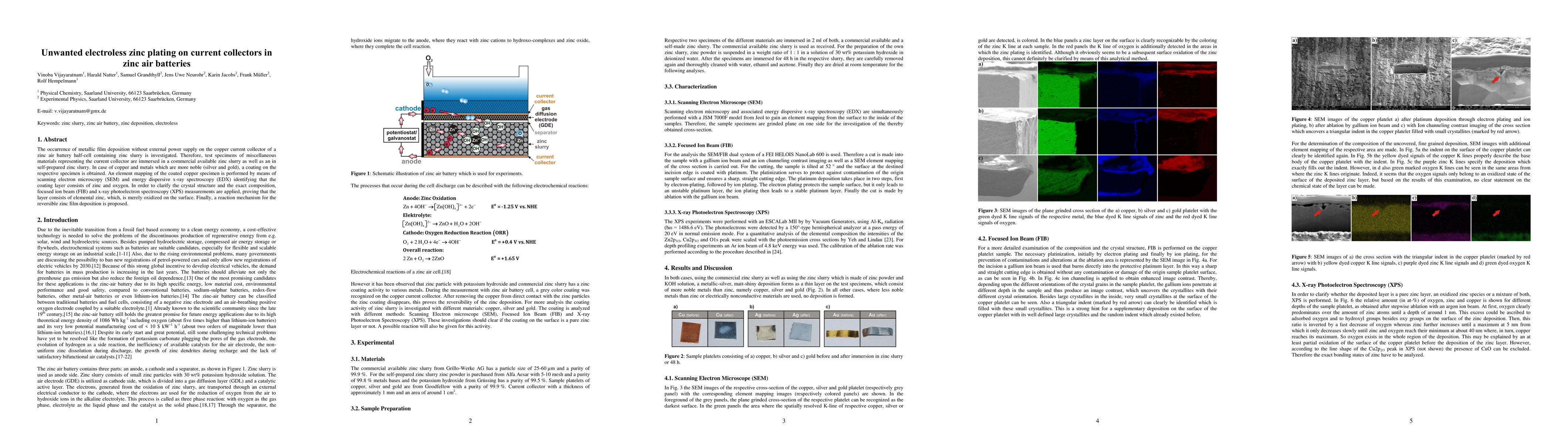 This study investigates the spontaneous electroless zinc plating on copper current collectors in zinc air batteries, revealing that zinc slurry induces metallic film deposition without external power. SEM and EDX analysis confirm the coating's composition as oxidized elemental zinc, with FIB and XPS providing further structural insights, leading to a proposed reaction mechanism for the observed phenomenon.