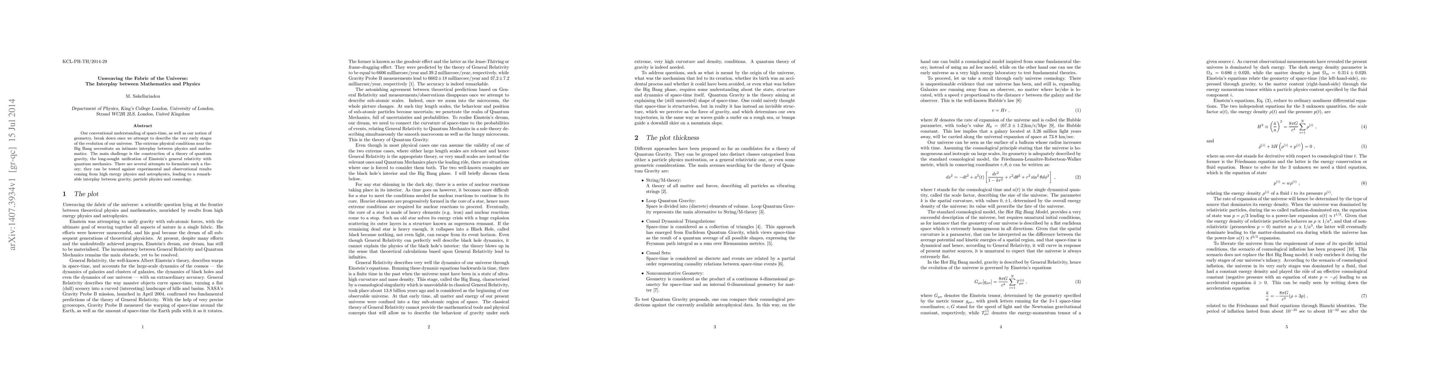 Our conventional understanding of space-time, as well as our notion of geometry, break down once we attempt to describe the very early stages of the evolution of our universe. The extreme physical conditions near the Big Bang necessitate an intimate interplay between physics and mathematics. The main challenge is the construction of a theory of quantum gravity, the long-sought unification of Einstein's general relativity with quantum mechanics. There are several attempts to formulate such a theory; they can be tested against experimental and observational results coming from high energy physics and astrophysics, leading to a remarkable interplay between gravity, particle physics and cosmology.