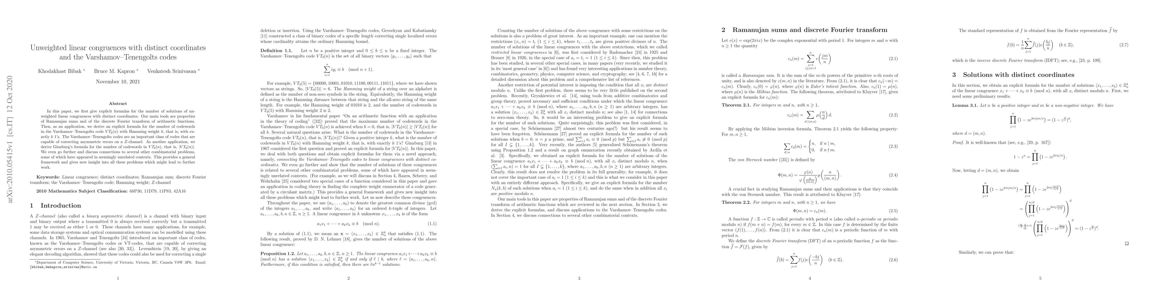 In this paper, we first give explicit formulas for the number of solutions of unweighted linear congruences with distinct coordinates. Our main tools are properties of Ramanujan sums and of the discrete Fourier transform of arithmetic functions. Then, as an application, we derive an explicit formula for the number of codewords in the Varshamov--Tenengolts code $VT_b(n)$ with Hamming weight $k$, that is, with exactly $k$ $1$'s. The Varshamov--Tenengolts codes are an important class of codes that are capable of correcting asymmetric errors on a $Z$-channel. As another application, we derive Ginzburg's formula for the number of codewords in $VT_b(n)$, that is, $|VT_b(n)|$. We even go further and discuss connections to several other combinatorial problems, some of which have appeared in seemingly unrelated contexts. This provides a general framework and gives new insight into all these problems which might lead to further work.