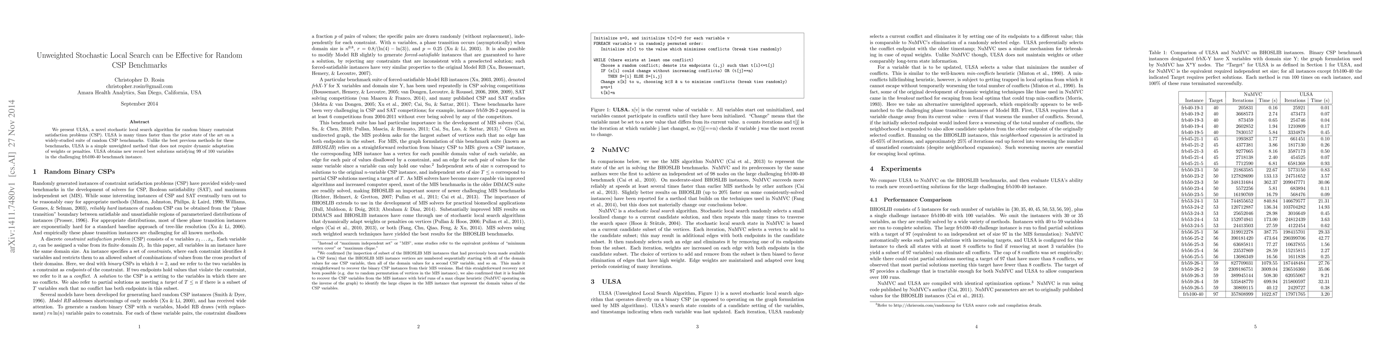 Summary: ULSA, a new unweighted stochastic local search algorithm, outperforms previous methods on random binary CSP benchmarks, achieving record-breaking results without requiring dynamic adaptation of weights or penalties. ULSA notably satisfies 99 of 100 variables in the frb100-40 benchmark.
