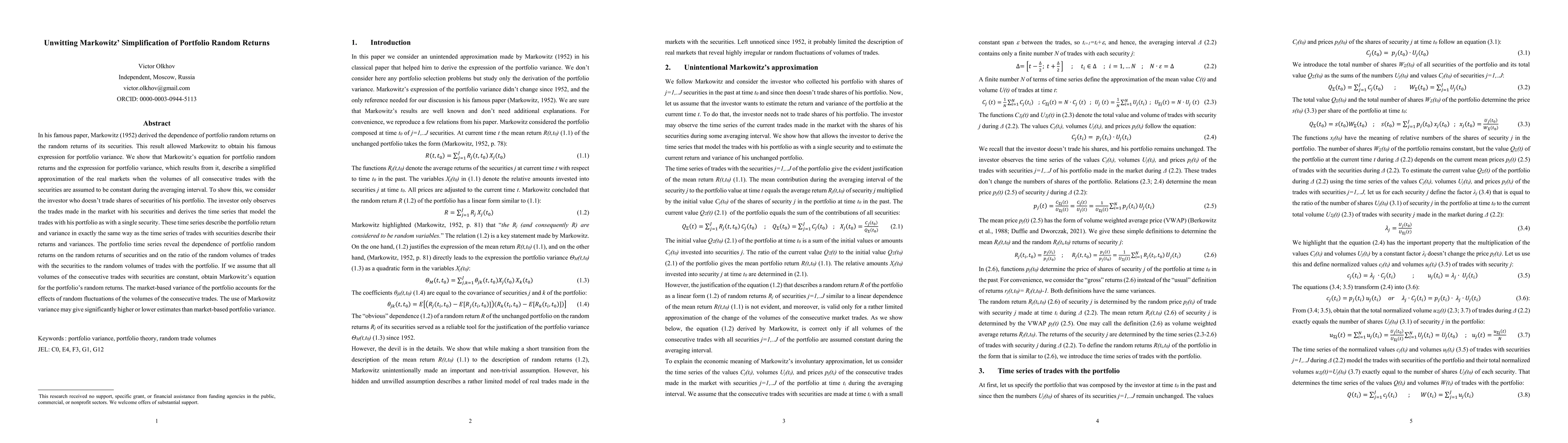 In his famous paper, Markowitz (1952) derived the dependence of portfolio random returns on the random returns of its securities. This result allowed Markowitz to obtain his famous expression for portfolio variance. We show that Markowitz's equation for portfolio random returns and the expression for portfolio variance, which results from it, describe a simplified approximation of the real markets when the volumes of all consecutive trades with the securities are assumed to be constant during the averaging interval. To show this, we consider the investor who doesn't trade shares of securities of his portfolio. The investor only observes the trades made in the market with his securities and derives the time series that model the trades with his portfolio as with a single security. These time series describe the portfolio return and variance in exactly the same way as the time series of trades with securities describe their returns and variances. The portfolio time series reveal the dependence of portfolio random returns on the random returns of securities and on the ratio of the random volumes of trades with the securities to the random volumes of trades with the portfolio. If we assume that all volumes of the consecutive trades with securities are constant, obtain Markowitz's equation for the portfolio's random returns. The market-based variance of the portfolio accounts for the effects of random fluctuations of the volumes of the consecutive trades. The use of Markowitz variance may give significantly higher or lower estimates than market-based portfolio variance.