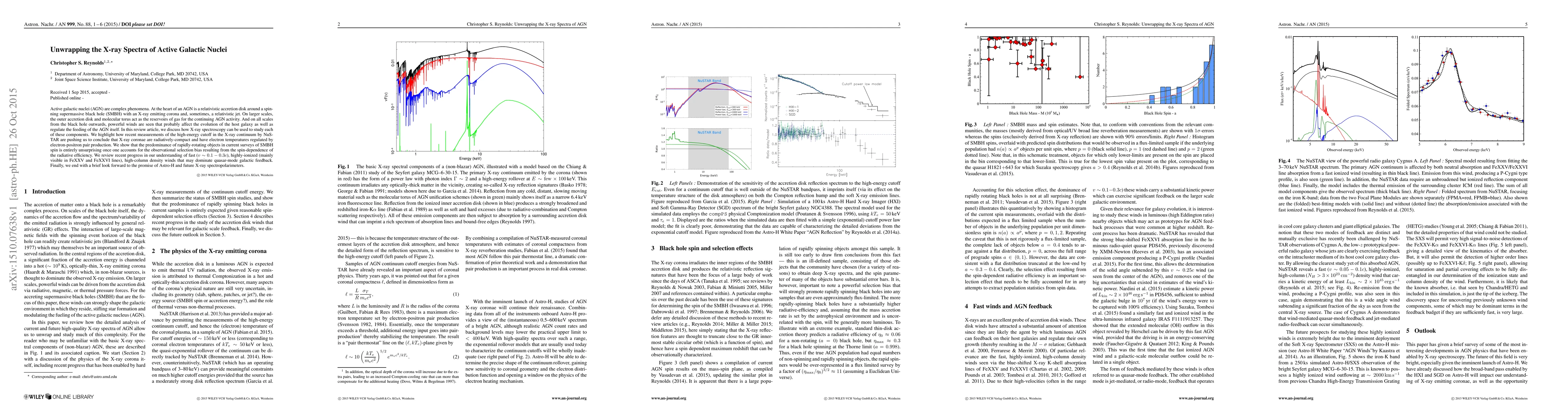 Active galactic nuclei (AGN) are complex phenomena. At the heart of an AGN is a relativistic accretion disk around a spinning supermassive black hole (SMBH) with an X-ray emitting corona and, sometimes, a relativistic jet. On larger scales, the outer accretion disk and molecular torus act as the reservoirs of gas for the continuing AGN activity. And on all scales from the black hole outwards, powerful winds are seen that probably affect the evolution of the host galaxy as well as regulate the feeding of the AGN itself. In this review article, we discuss how X-ray spectroscopy can be used to study each of these components. We highlight how recent measurements of the high-energy cutoff in the X-ray continuum by NuSTAR are pushing us to conclude that X-ray coronae are radiatively-compact and have electron temperatures regulated by electron-positron pair production. We show that the predominance of rapidly-rotating objects in current surveys of SMBH spin is entirely unsurprising once one accounts for the observational selection bias resulting from the spin-dependence of the radiative efficiency. We review recent progress in our understanding of fast (v~0.1-0.3c), highly-ionized (mainly visible in FeXXV and FeXXVI lines), high-column density winds that may dominate quasar-mode galactic feedback. Finally, we end with a brief look forward to the promise of Astro-H and future X-ray spectropolarimeters.