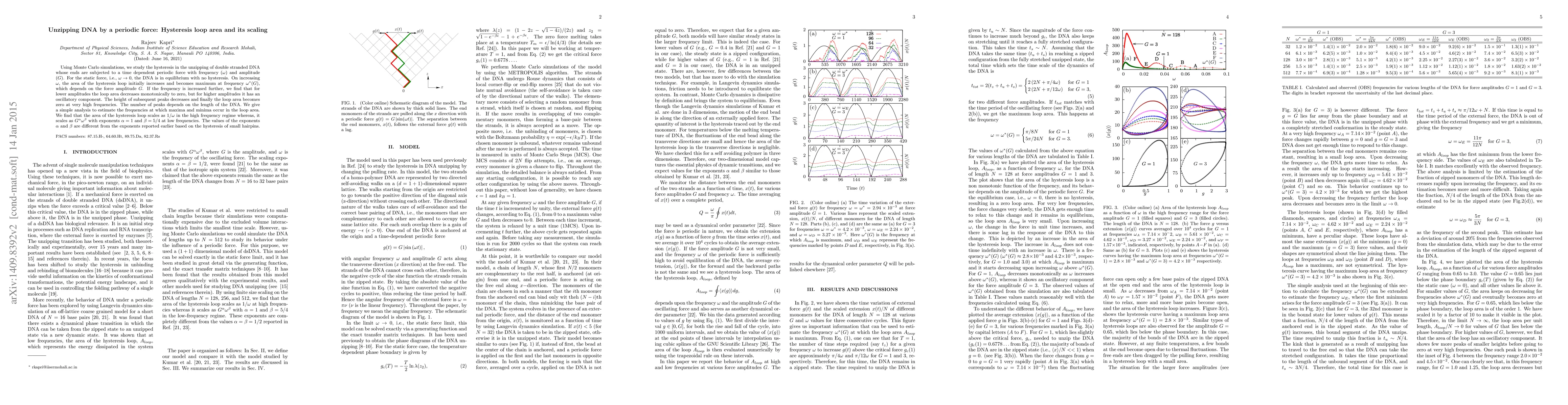This paper investigates the hysteresis in unzipping double-stranded DNA under a periodic force using Monte Carlo simulations, finding that the hysteresis loop area scales differently at low and high frequencies, with exponents differing from previous studies on smaller hairpins. The area scales as $1/\omega$ at high frequencies and $G^{\alpha} \omega^{\beta}$ at low frequencies with $\alpha = 1$ and $\beta = 5/4$.