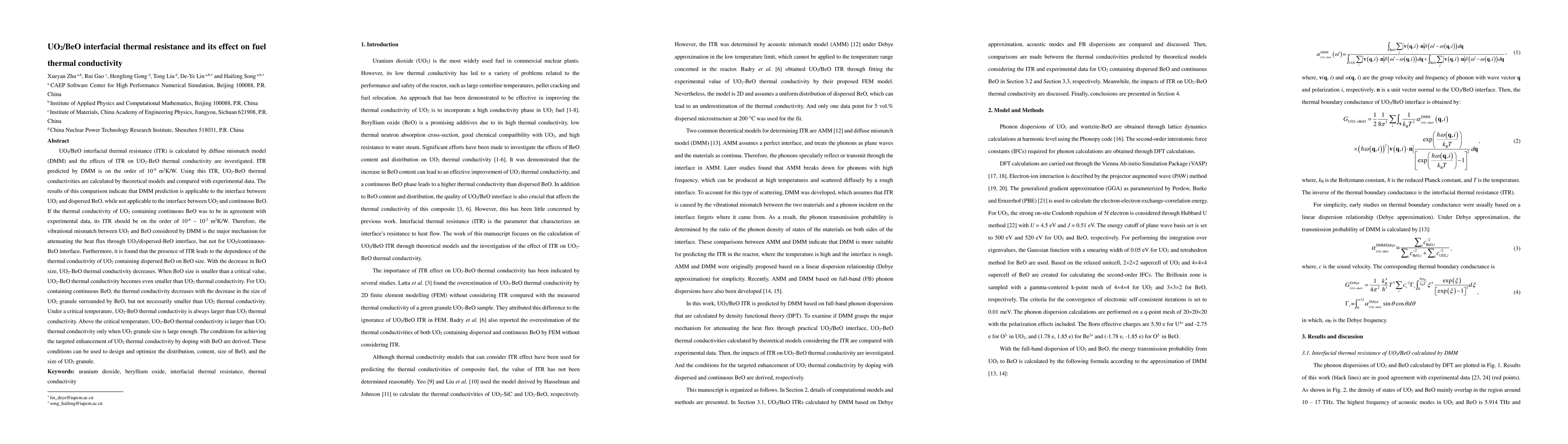 The research investigates UO2/BeO interfacial thermal resistance (ITR) using the diffuse mismatch model (DMM), finding it significant for dispersed but not continuous BeO interfaces. The presence of ITR influences the thermal conductivity of UO2 containing dispersed BeO, where smaller BeO sizes lead to lower conductivity, potentially even below that of pure UO2. For continuous BeO, conductivity depends on UO2 granule size relative to BeO.