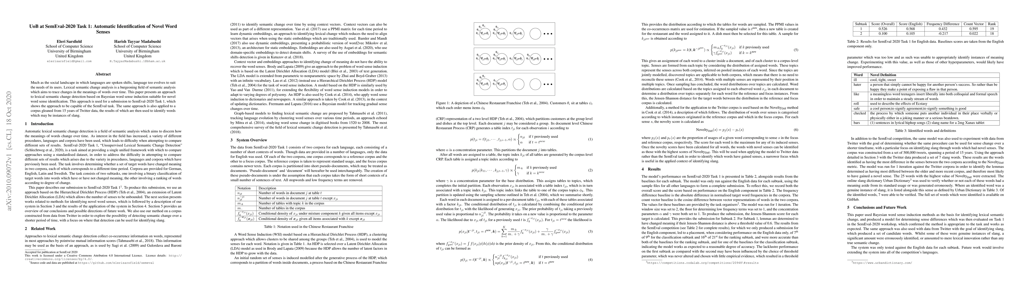 Much as the social landscape in which languages are spoken shifts, language too evolves to suit the needs of its users. Lexical semantic change analysis is a burgeoning field of semantic analysis which aims to trace changes in the meanings of words over time. This paper presents an approach to lexical semantic change detection based on Bayesian word sense induction suitable for novel word sense identification. This approach is used for a submission to SemEval-2020 Task 1, which shows the approach to be capable of the SemEval task. The same approach is also applied to a corpus gleaned from 15 years of Twitter data, the results of which are then used to identify words which may be instances of slang.