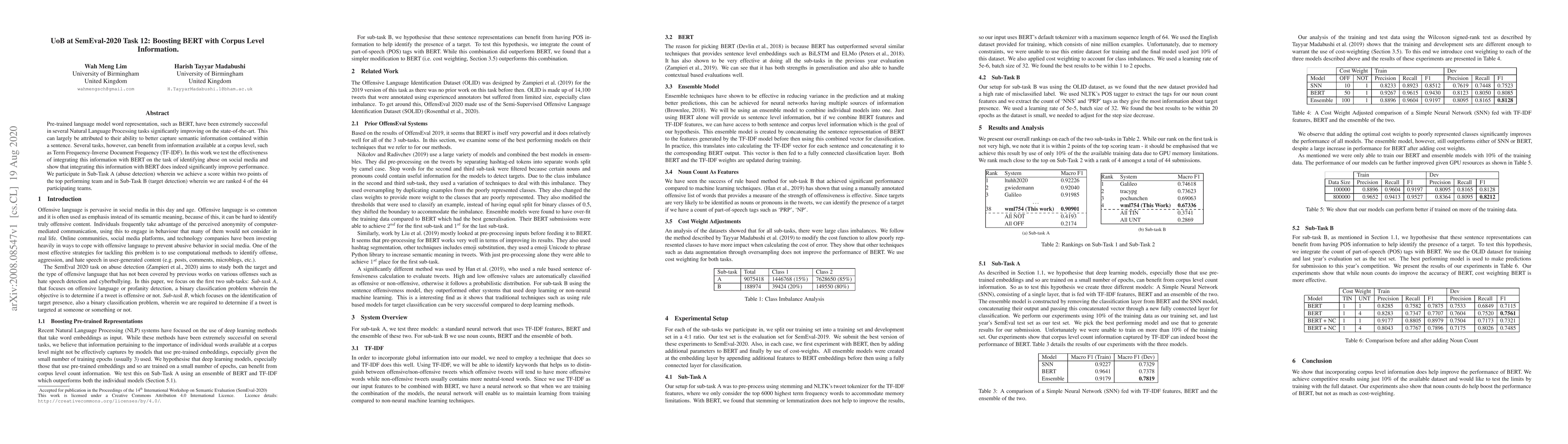 A research paper shows that integrating corpus-level information with BERT improves performance in social media abuse detection tasks. The study achieves high rankings in two sub-tasks of SemEval-2020 Task 12.