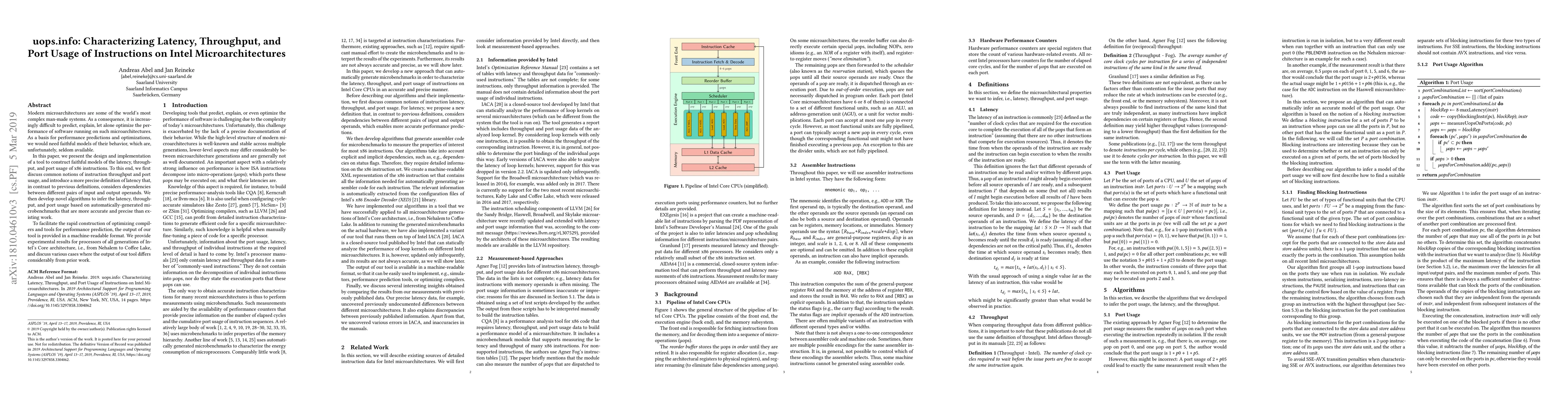This paper introduces a tool called uops.info to model the latency, throughput, and port usage of x86 instructions on Intel microarchitectures. It presents novel algorithms for inferring these metrics based on microbenchmarks, offering a more precise definition of latency and generating machine-readable output for optimizing compilers and performance prediction tools.