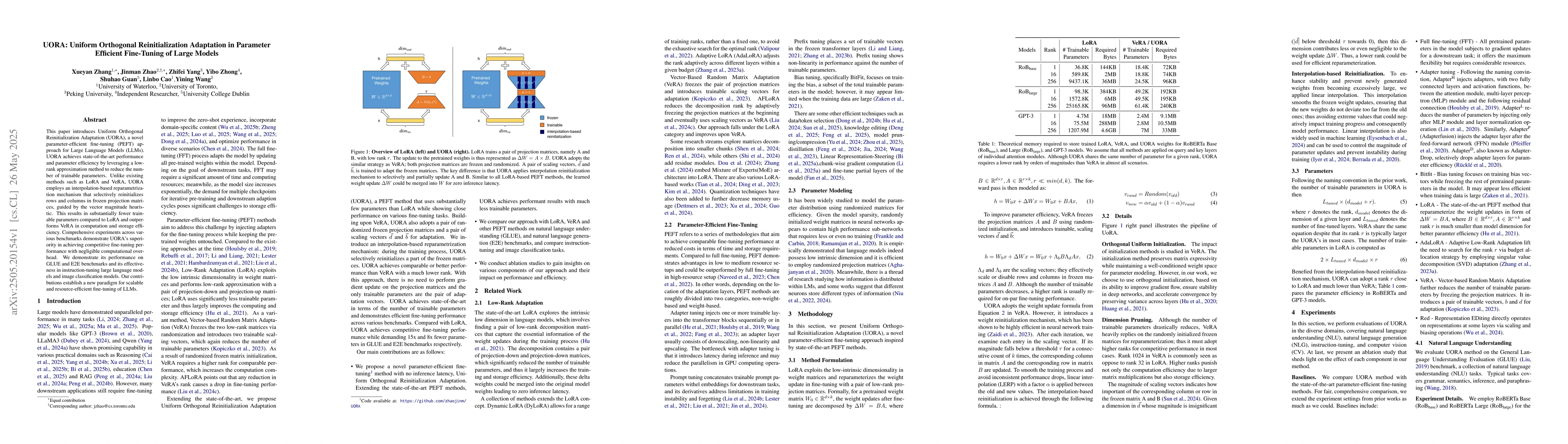 The research introduces UORA, a PEFT approach using low-rank approximation to reduce trainable parameters in LLMs, employing an interpolation-based reparametrization mechanism for selective reinitialization of frozen projection matrices.