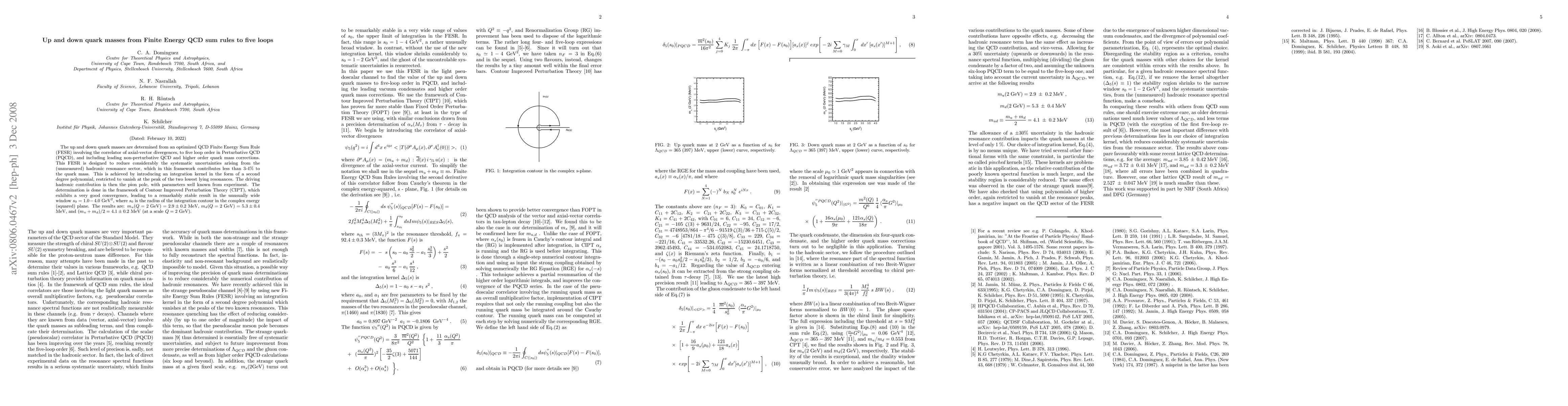 This paper determines the up and down quark masses using optimized QCD Finite Energy Sum Rules to five loops, minimizing systematic uncertainties from the hadronic resonance sector. The results are $m_u(Q= 2 {GeV}) = 2.9 \pm 0.2$ MeV and $m_d(Q= 2 {GeV}) = 5.3 \pm 0.4$ MeV, with a combined average of $(m_u + m_d)/2 = 4.1 \pm 0.2$ MeV.