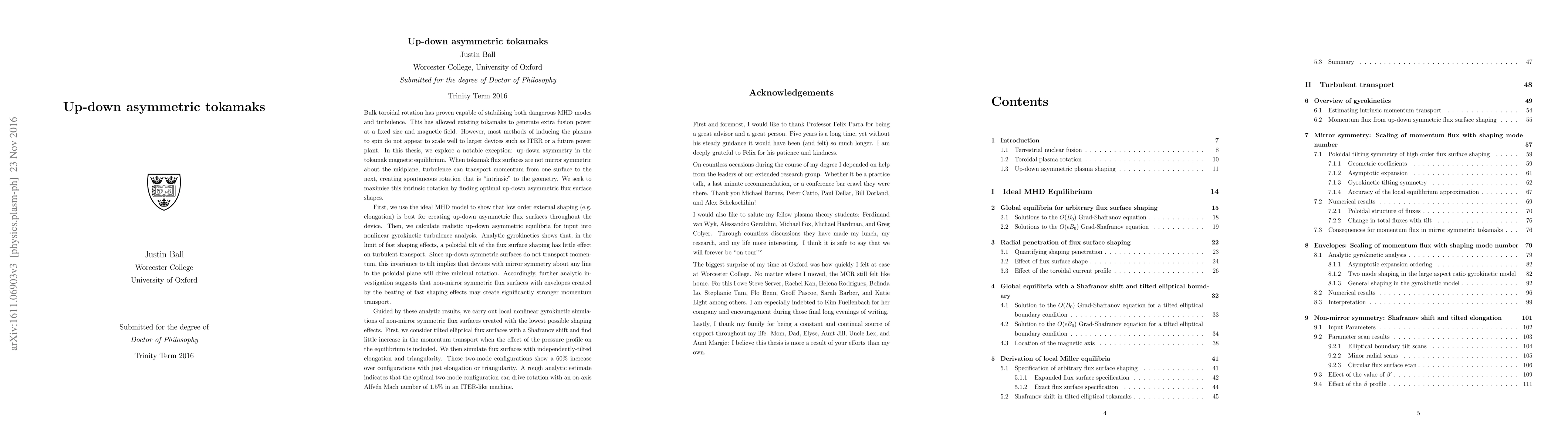 Bulk toroidal rotation has proven capable of stabilising both dangerous MHD modes and turbulence. In this thesis, we explore a method to drive rotation in large tokamaks: up-down asymmetry in the magnetic equilibrium. We seek to maximise this rotation by finding optimal up-down asymmetric flux surface shapes. First, we use the ideal MHD model to show that low order external shaping (e.g. elongation) is best for creating up-down asymmetric flux surfaces throughout the device. Then, we calculate realistic up-down asymmetric equilibria for input into nonlinear gyrokinetic turbulence analysis. Analytic gyrokinetics shows that, in the limit of fast shaping effects, a poloidal tilt of the flux surface shaping has little effect on turbulent transport. Since up-down symmetric surfaces do not transport momentum, this invariance to tilt implies that devices with mirror symmetry about any line in the poloidal plane will drive minimal rotation. Accordingly, further analytic investigation suggests that non-mirror symmetric flux surfaces with envelopes created by the beating of fast shaping effects may create significantly stronger momentum transport. Guided by these analytic results, we carry out local nonlinear gyrokinetic simulations of non-mirror symmetric flux surfaces created with the lowest possible shaping effects. First, we consider tilted elliptical flux surfaces with a Shafranov shift and find little increase in the momentum transport when the effect of the pressure profile on the equilibrium is included. We then simulate flux surfaces with independently-tilted elongation and triangularity. These two-mode configurations show a $60\%$ increase over configurations with just elongation or triangularity. A rough analytic estimate indicates that the optimal two-mode configuration can drive rotation with an on-axis Alfven Mach number of $1.5 \%$ in an ITER-like machine.