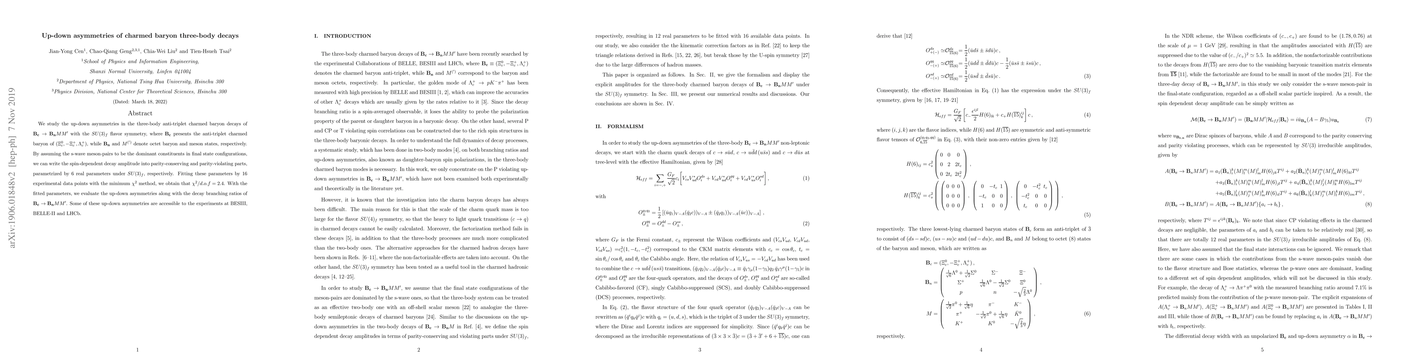 This paper investigates up-down asymmetries in three-body decays of anti-triplet charmed baryons, ${\bf B_c}\to{\bf B_n}MM'$, under $SU(3)_f$ flavor symmetry. The study fits parameters to experimental data to evaluate these asymmetries and branching ratios, with some results testable at BESIII, BELLE-II, and LHCb.