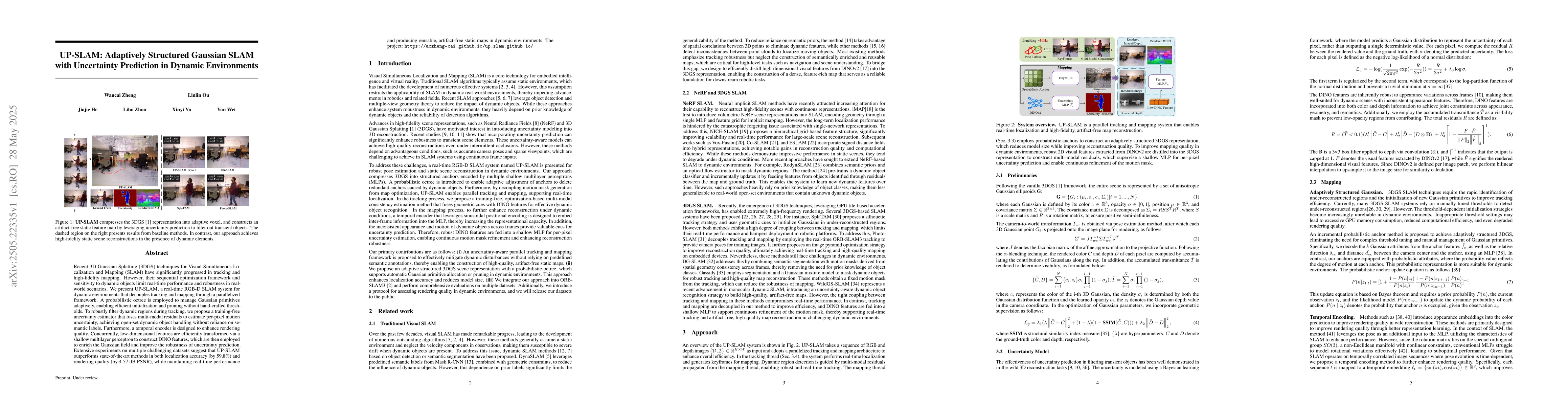 UP-SLAM employs a parallelized framework decoupling tracking and mapping, using a probabilistic octree for adaptive Gaussian primitive management. It introduces a training-free uncertainty estimator for dynamic region filtering and a temporal encoder for rendering quality enhancement. DINO features are utilized to enrich the Gaussian field, improving uncertainty prediction robustness.