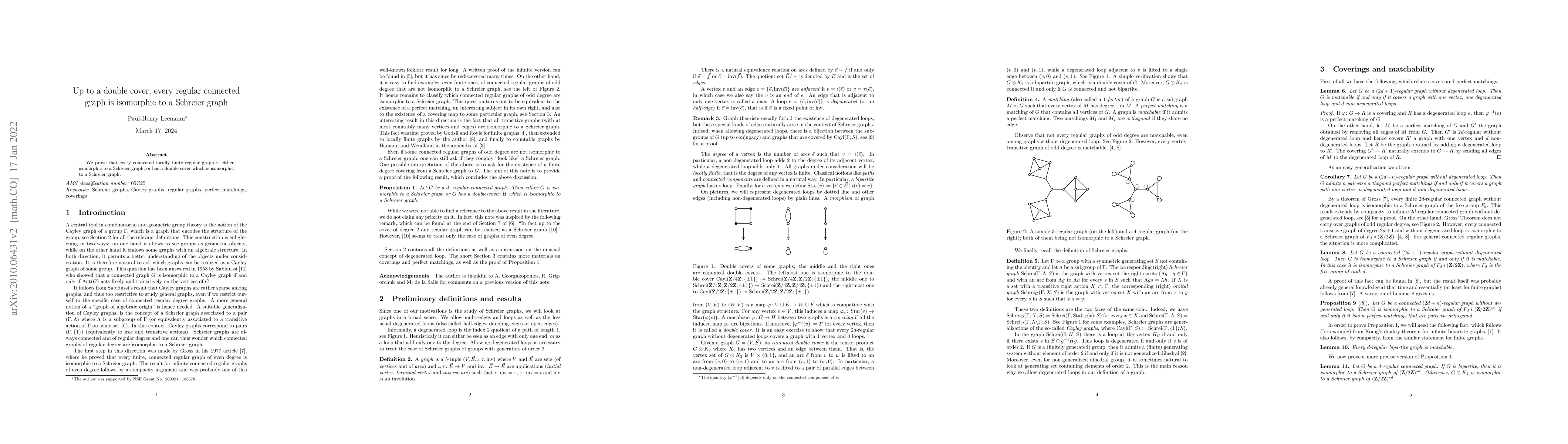 Summary: We demonstrate that any connected locally finite regular graph can be double-covered to form an isomorphic structure to a Schreier graph. This reveals a deep connection between regular graphs and Schreier graphs.