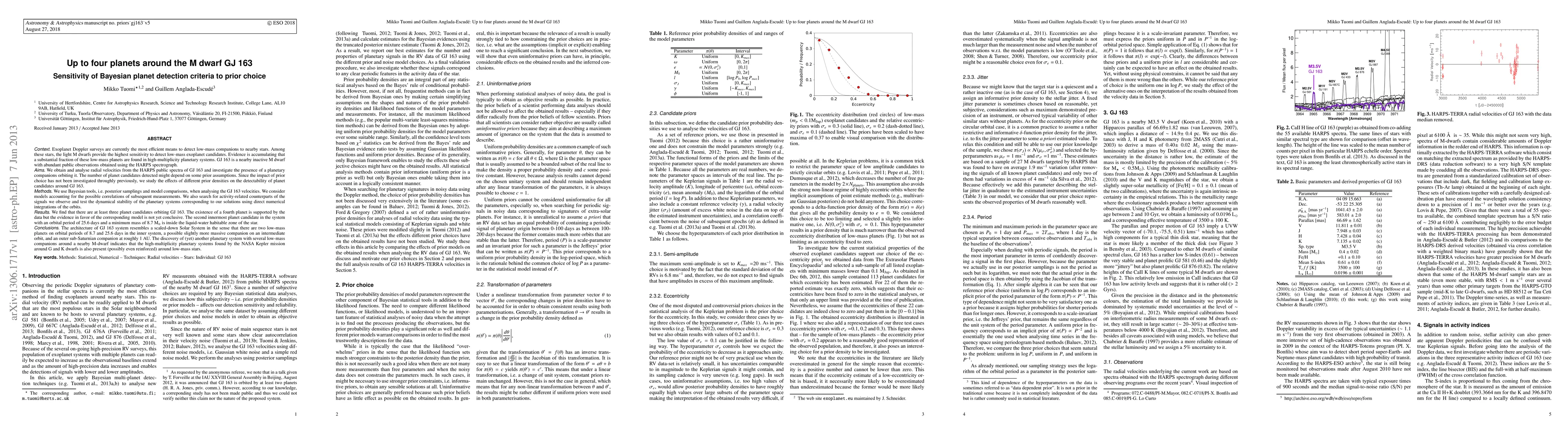 Exoplanet Doppler surveys are currently the most efficient means to detect low-mass companions to nearby stars. Among these stars, the light M dwarfs provide the highest sensitivity to detect low-mass exoplanet candidates. Evidence is accumulating that a substantial fraction of these low-mass planets are found in high-multiplicity planetary systems. GJ 163 is a nearby inactive M dwarf with abundant public observations obtained using the HARPS spectrograph. We obtain and analyse radial velocities from the HARPS public spectra of GJ 163 and investigate the presence of a planetary companions orbiting it. The number of planet candidates detected might depend on some prior assumptions. Since the impact of prior choice has not been investigated throughly previously, we study the effects of different prior densities on the detectability of planet candidates around GJ 163. We use Bayesian tools, i.e. posterior samplings and model comparisons, when analysing the GJ 163 velocities. We consider models accounting for the possible correlations of subsequent measurements. We also search for activity-related counterparts of the signals we observe and test the dynamical stability of the planetary systems corresponding to our solutions using direct numerical integrations of the orbits. We find that there are at least three planet candidates orbiting GJ 163. The existence of a fourth planet is supported by the data but the evidence in favor of the corresponding model is not yet conclusive. The second innermost planet candidate in the system with an orbital period of 25.6 days and a minimum mass of 8.7 Me is inside the liquid-water habitable zone of the star.