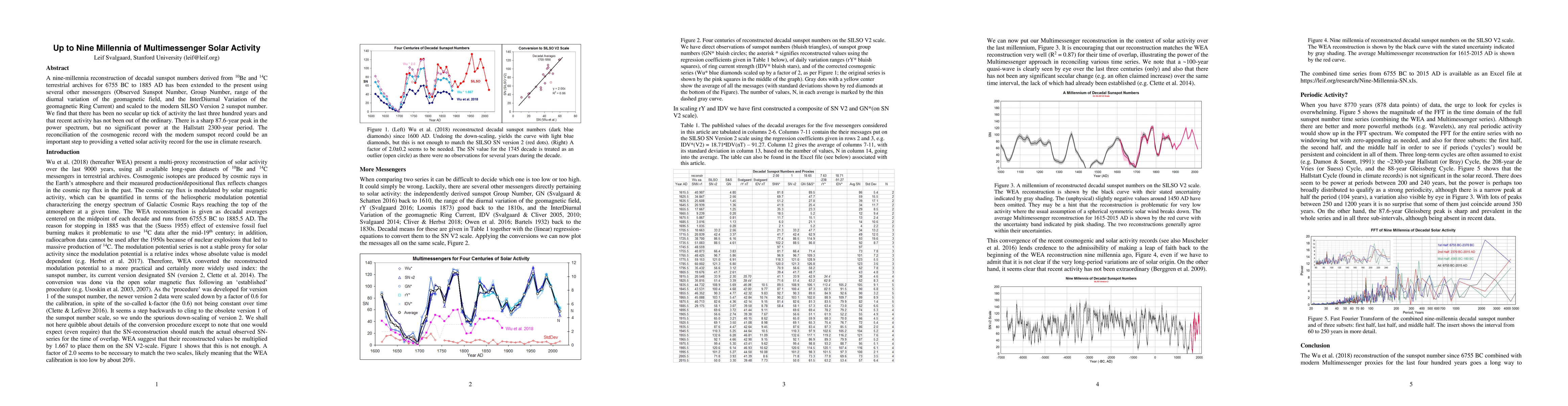 A nine-millennia reconstruction of decadal sunspot numbers derived from 10Be and 14C terrestrial archives for 6755 BC to 1885 AD has been extended to the present using several other messengers (Observed Sunspot Number, Group Number, range of the diurnal variation of the geomagnetic field, and the InterDiurnal Variation of the geomagnetic Ring Current) and scaled to the modern SILSO Version 2 sunspot number. We find that there has been no secular up tick of activity the last three hundred years and that recent activity has not been out of the ordinary. There is a sharp 87.6-year peak in the power spectrum, but no significant power at the Hallstatt 2300-year period. The reconciliation of the cosmogenic record with the modern sunspot record could be an important step to providing a vetted solar activity record for the use in climate research.