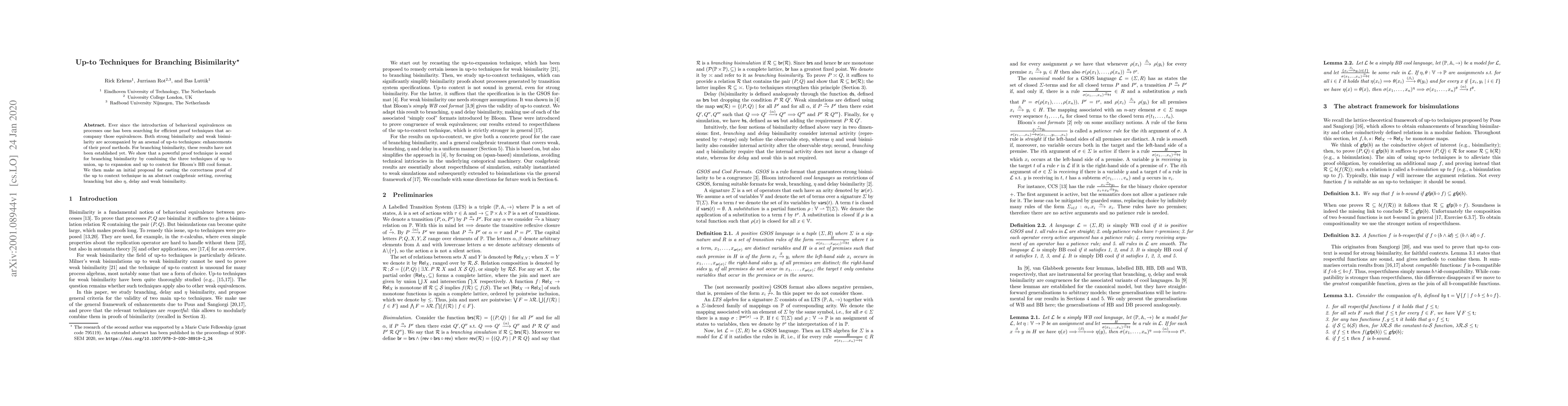 Ever since the introduction of behavioral equivalences on processes one has been searching for efficient proof techniques that accompany those equivalences. Both strong bisimilarity and weak bisimilarity are accompanied by an arsenal of up-to techniques: enhancements of their proof methods. For branching bisimilarity, these results have not been established yet. We show that a powerful proof technique is sound for branching bisimilarity by combining the three techniques of up to union, up to expansion and up to context for Bloom's BB cool format. We then make an initial proposal for casting the correctness proof of the up to context technique in an abstract coalgebraic setting, covering branching but also {\eta}, delay and weak bisimilarity.