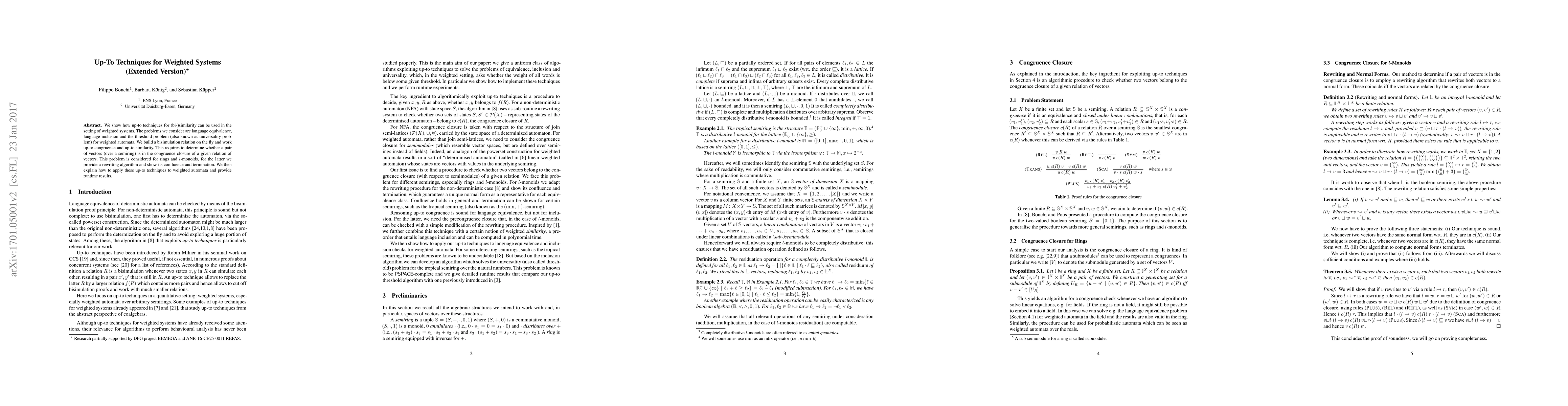 This research paper develops new techniques for weighted systems to solve problems related to language equivalence, inclusion, and universality using up-to methods, providing a rewriting algorithm with confluence and termination for l-monoids.