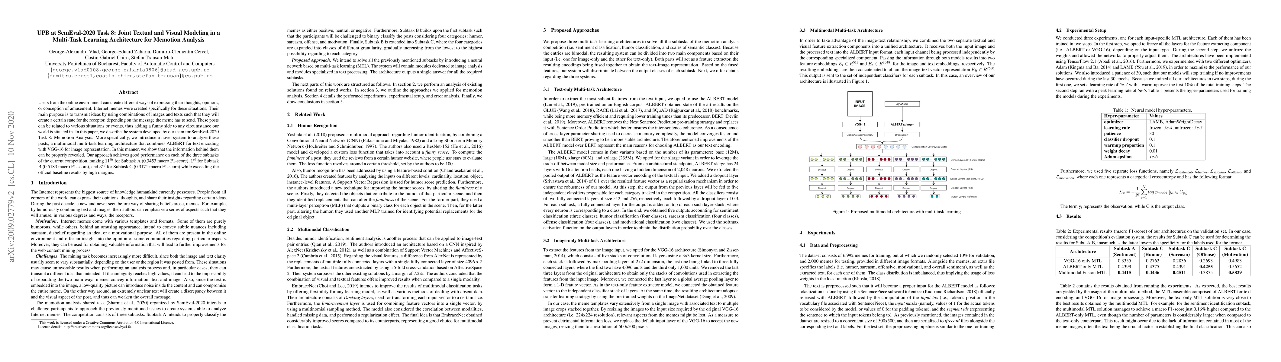 Users from the online environment can create different ways of expressing their thoughts, opinions, or conception of amusement. Internet memes were created specifically for these situations. Their main purpose is to transmit ideas by using combinations of images and texts such that they will create a certain state for the receptor, depending on the message the meme has to send. These posts can be related to various situations or events, thus adding a funny side to any circumstance our world is situated in. In this paper, we describe the system developed by our team for SemEval-2020 Task 8: Memotion Analysis. More specifically, we introduce a novel system to analyze these posts, a multimodal multi-task learning architecture that combines ALBERT for text encoding with VGG-16 for image representation. In this manner, we show that the information behind them can be properly revealed. Our approach achieves good performance on each of the three subtasks of the current competition, ranking 11th for Subtask A (0.3453 macro F1-score), 1st for Subtask B (0.5183 macro F1-score), and 3rd for Subtask C (0.3171 macro F1-score) while exceeding the official baseline results by high margins.