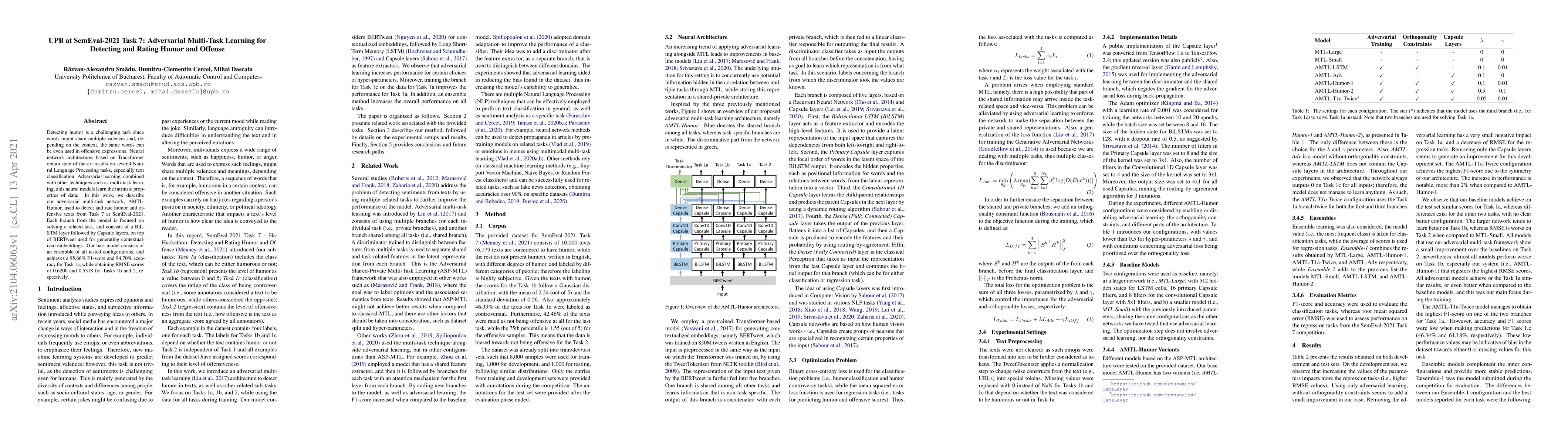 Detecting humor is a challenging task since words might share multiple valences and, depending on the context, the same words can be even used in offensive expressions. Neural network architectures based on Transformer obtain state-of-the-art results on several Natural Language Processing tasks, especially text classification. Adversarial learning, combined with other techniques such as multi-task learning, aids neural models learn the intrinsic properties of data. In this work, we describe our adversarial multi-task network, AMTL-Humor, used to detect and rate humor and offensive texts from Task 7 at SemEval-2021. Each branch from the model is focused on solving a related task, and consists of a BiLSTM layer followed by Capsule layers, on top of BERTweet used for generating contextualized embeddings. Our best model consists of an ensemble of all tested configurations, and achieves a 95.66% F1-score and 94.70% accuracy for Task 1a, while obtaining RMSE scores of 0.6200 and 0.5318 for Tasks 1b and 2, respectively.