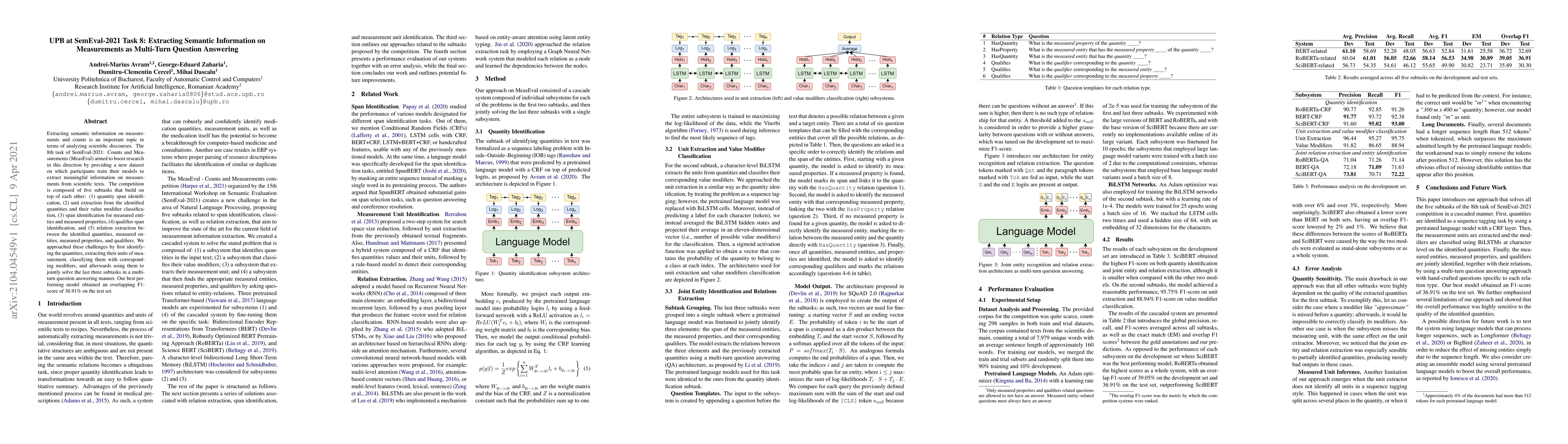 Extracting semantic information on measurements and counts is an important topic in terms of analyzing scientific discourses. The 8th task of SemEval-2021: Counts and Measurements (MeasEval) aimed to boost research in this direction by providing a new dataset on which participants train their models to extract meaningful information on measurements from scientific texts. The competition is composed of five subtasks that build on top of each other: (1) quantity span identification, (2) unit extraction from the identified quantities and their value modifier classification, (3) span identification for measured entities and measured properties, (4) qualifier span identification, and (5) relation extraction between the identified quantities, measured entities, measured properties, and qualifiers. We approached these challenges by first identifying the quantities, extracting their units of measurement, classifying them with corresponding modifiers, and afterwards using them to jointly solve the last three subtasks in a multi-turn question answering manner. Our best performing model obtained an overlapping F1-score of 36.91% on the test set.