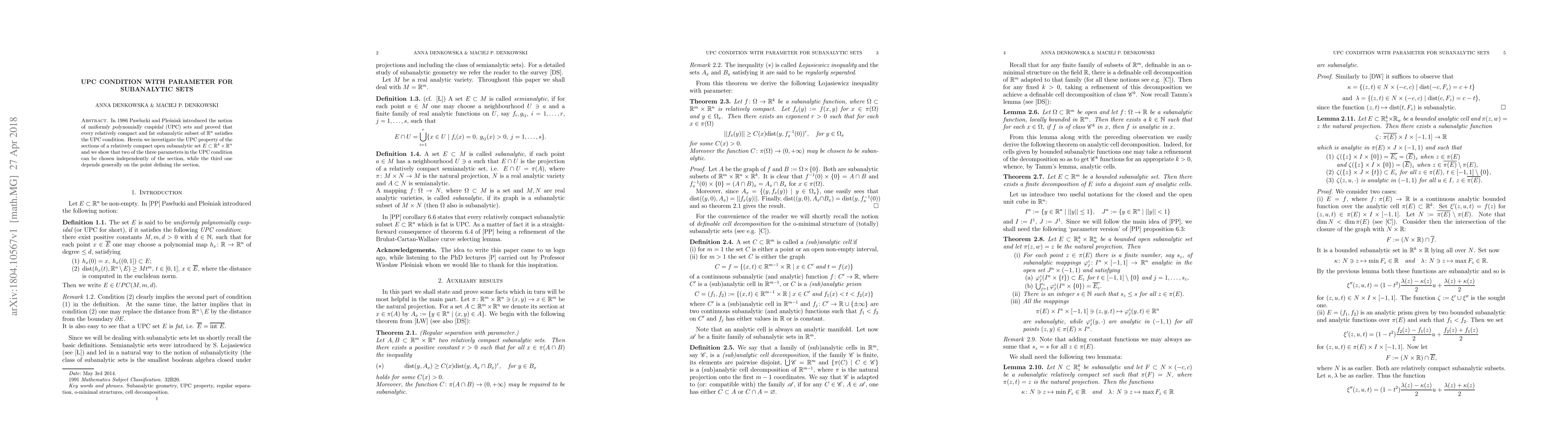 In 1986 Paw{\l}ucki and Ple\'sniak introduced the notion of {\sl uniformly polynomially cuspidal} (UPC) sets and proved that every relatively compact and fat subanalytic subset of ${\Rz}^n$ satisfies the UPC condition. Herein we investigate the UPC property of the sections of a relatively compact open subanalytic set $E\subset{\Rz}^k\times{\Rz}^n$ and we show that two of the three parameters in the UPC condition can be chosen independently of the section, while the third one depends generally on the point defining the section.