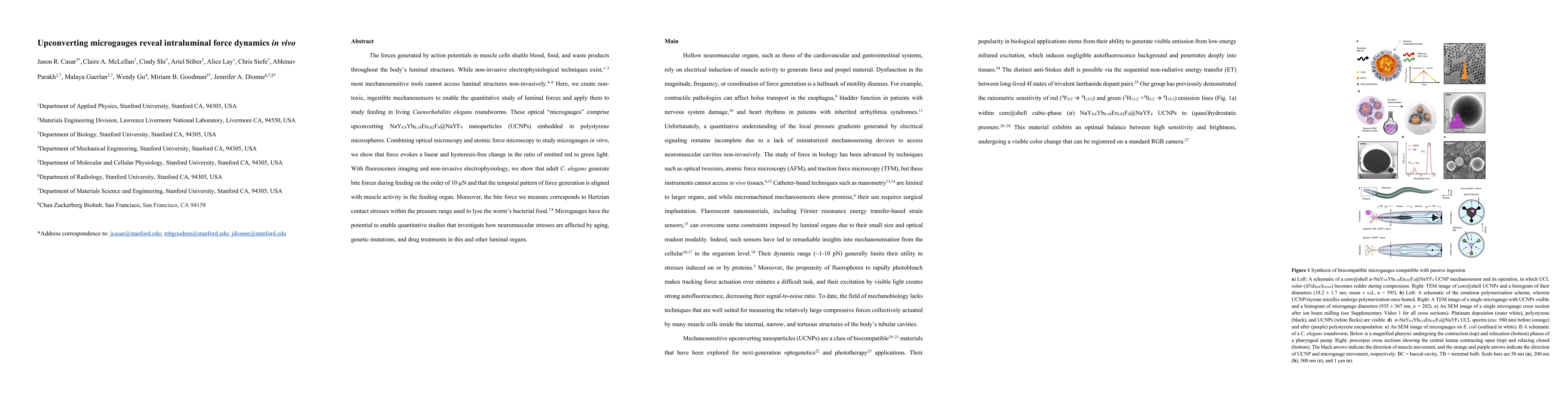 The forces generated by action potentials in muscle cells shuttle blood, food and waste products throughout the luminal structures of the body. Although non-invasive electrophysiological techniques exist, most mechanosensors cannot access luminal structures non-invasively. Here we introduce non-toxic ingestible mechanosensors to enable the quantitative study of luminal forces and apply them to study feeding in living Caenorhabditis elegans roundworms. These optical 'microgauges' comprise NaY0.8Yb0.18Er0.02F4@NaYF4 upconverting nanoparticles embedded in polystyrene microspheres. Combining optical microscopy and atomic force microscopy to study microgauges in vitro, we show that force evokes a linear and hysteresis-free change in the ratio of emitted red to green light. With fluorescence imaging and non-invasive electrophysiology, we show that adult C. elegans generate bite forces during feeding on the order of 10 micronewtons and that the temporal pattern of force generation is aligned with muscle activity in the feeding organ. Moreover, the bite force we measure corresponds to Hertzian contact stresses in the pressure range used to lyse the bacterial food of the worm. Microgauges have the potential to enable quantitative studies that investigate how neuromuscular stresses are affected by aging, genetic mutations and drug treatments in this organ and other luminal organs.