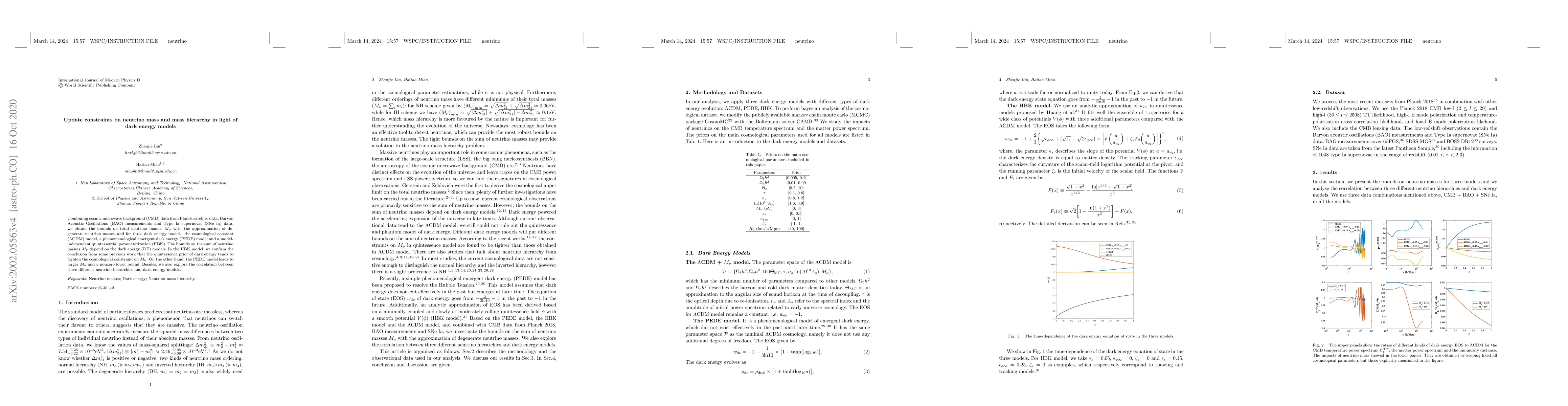 This paper updates constraints on neutrino mass and hierarchy using CMB, BAO, and SNe Ia data across three dark energy models. The results show that the sum of neutrino masses varies with the dark energy model, with the HBK model tightening constraints and the PEDE model allowing for larger masses and a nonzero lower bound.