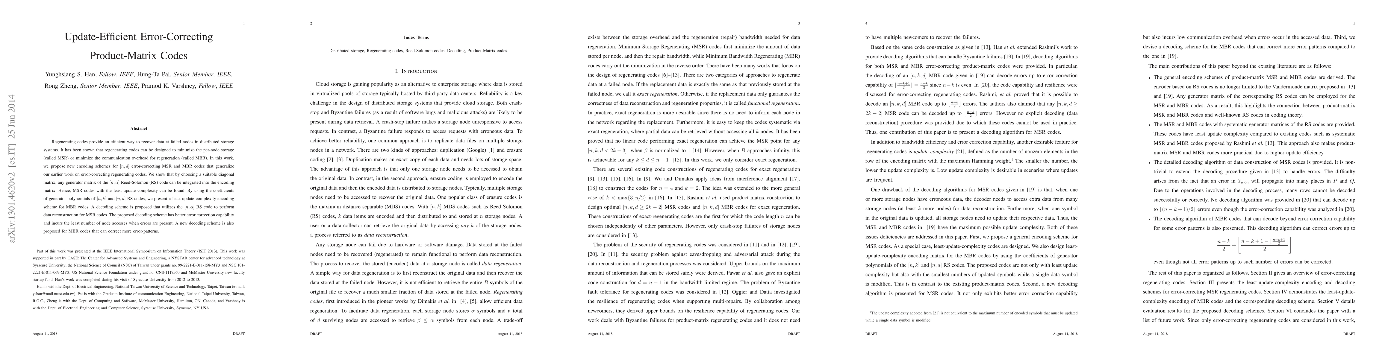 Regenerating codes provide an efficient way to recover data at failed nodes in distributed storage systems. It has been shown that regenerating codes can be designed to minimize the per-node storage (called MSR) or minimize the communication overhead for regeneration (called MBR). In this work, we propose new encoding schemes for $[n,d]$ error-correcting MSR and MBR codes that generalize our earlier work on error-correcting regenerating codes. We show that by choosing a suitable diagonal matrix, any generator matrix of the $[n,\alpha]$ Reed-Solomon (RS) code can be integrated into the encoding matrix. Hence, MSR codes with the least update complexity can be found. By using the coefficients of generator polynomials of $[n,k]$ and $[n,d]$ RS codes, we present a least-update-complexity encoding scheme for MBR codes. A decoding scheme is proposed that utilizes the $[n,\alpha]$ RS code to perform data reconstruction for MSR codes. The proposed decoding scheme has better error correction capability and incurs the least number of node accesses when errors are present. A new decoding scheme is also proposed for MBR codes that can correct more error-patterns.