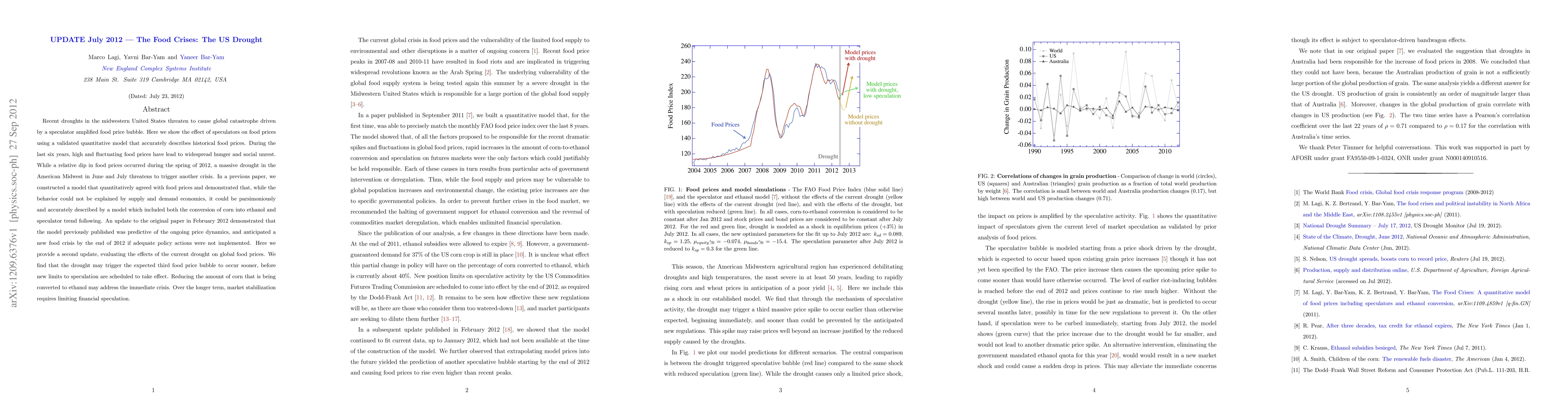 This paper updates the analysis of the 2012 US Midwest drought's potential to trigger a global food crisis, emphasizing the role of speculation and ethanol conversion in driving food prices. The authors predict a third food price bubble due to the drought, urging policy actions to mitigate immediate impacts and long-term market stabilization.