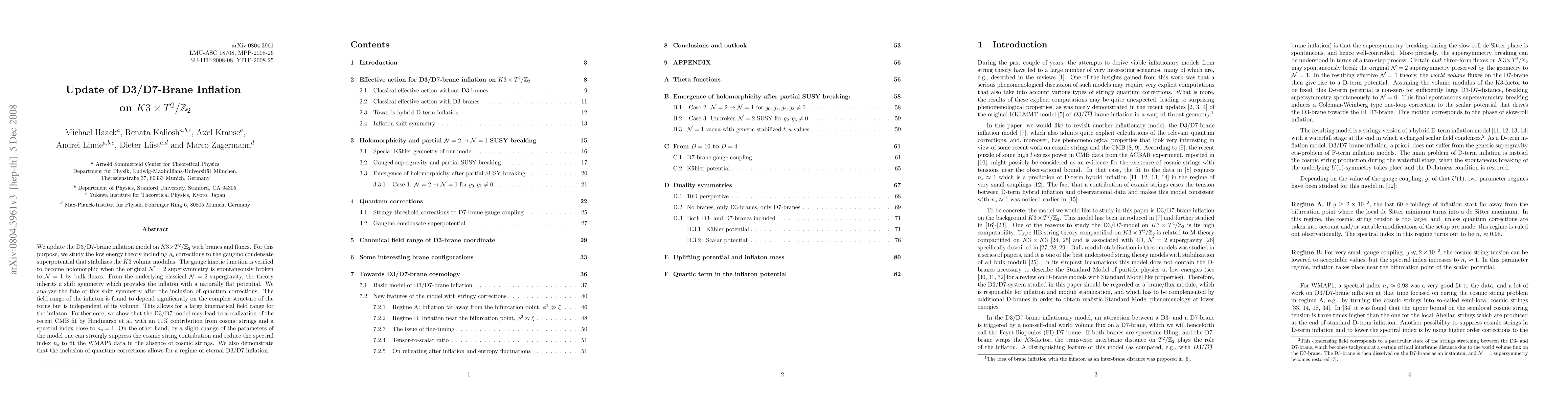 This paper updates the D3/D7-brane inflation model on K3 x T^2/Z_2 with branes and fluxes, focusing on g_s corrections and the stabilization of the K3 volume modulus. The model shows potential to fit recent CMB data, either with or without cosmic strings, and can sustain eternal inflation when quantum corrections are included.